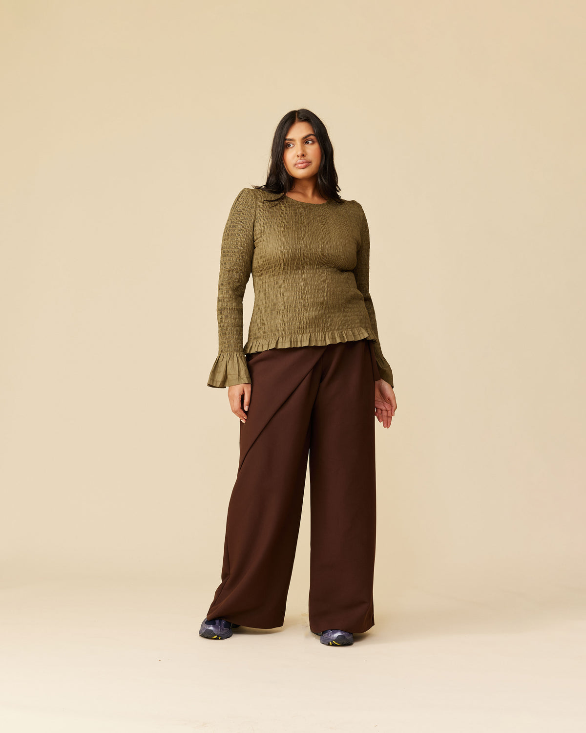 Long sleeve top designed in an olive coloured cotton. This top is shirred, giving it stretch all over. Features a high, round neckline and ruffles at the cuffs and hem.