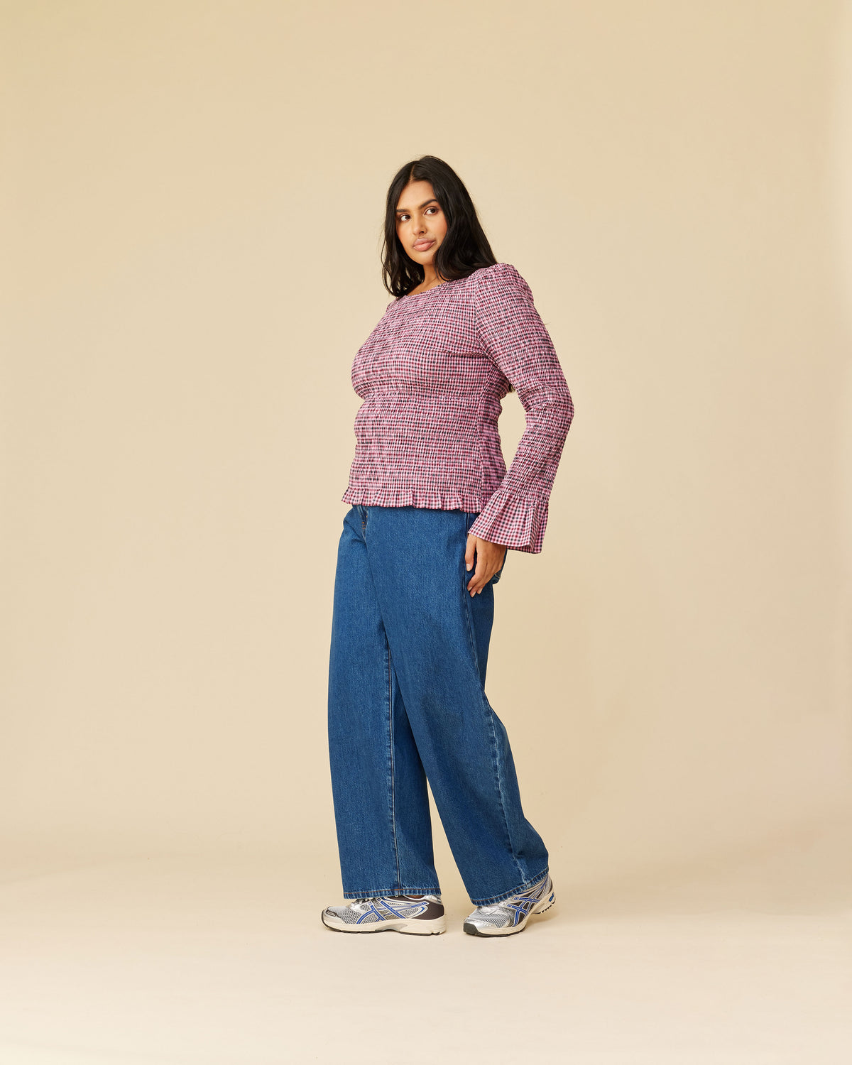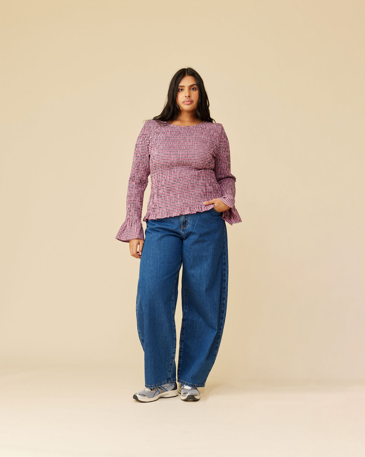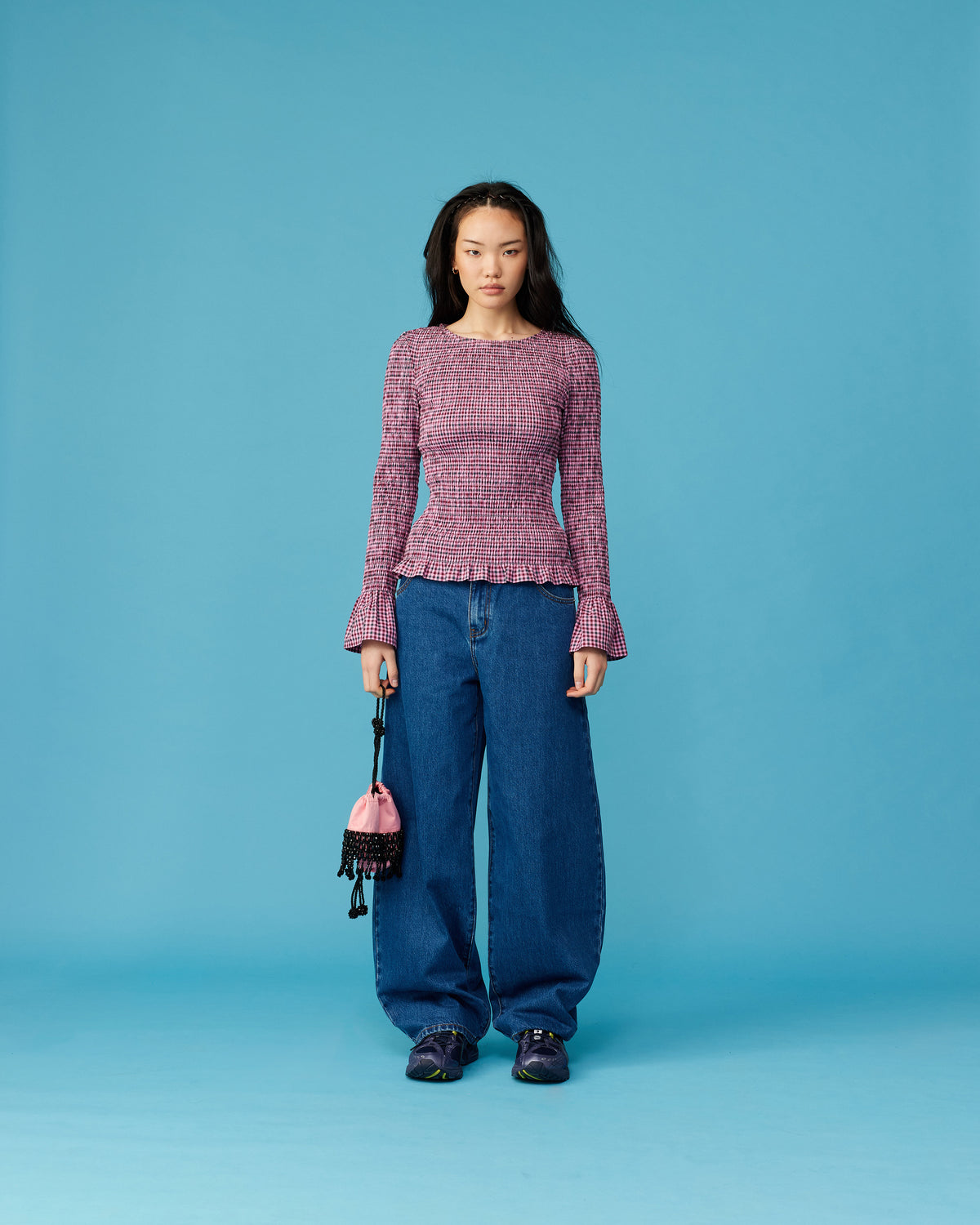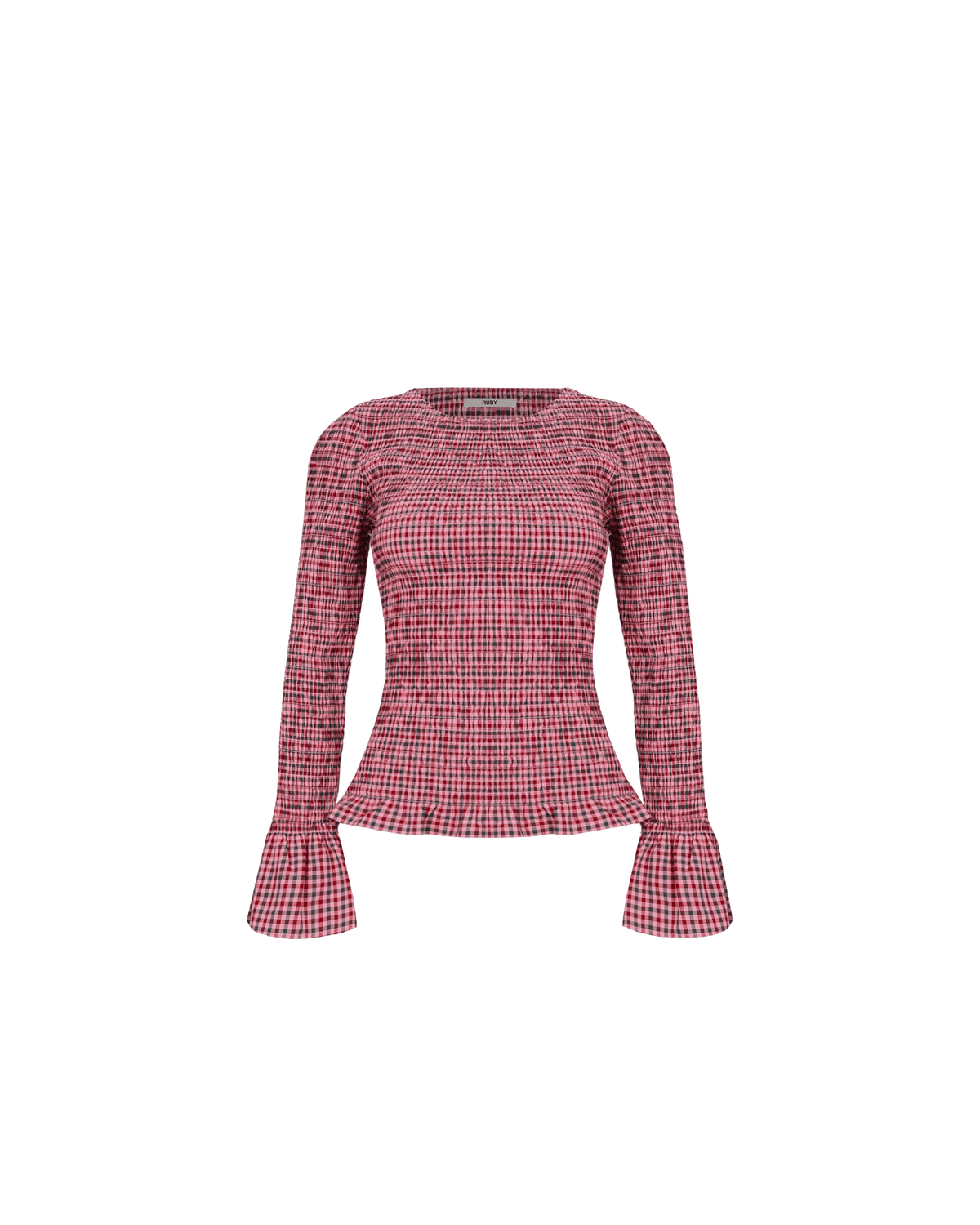 Long sleeve top designed in a pink and petrol gingham. This top is shirred, giving it stretch all over. Features a high, round neckline and ruffles at the cuffs and hem.