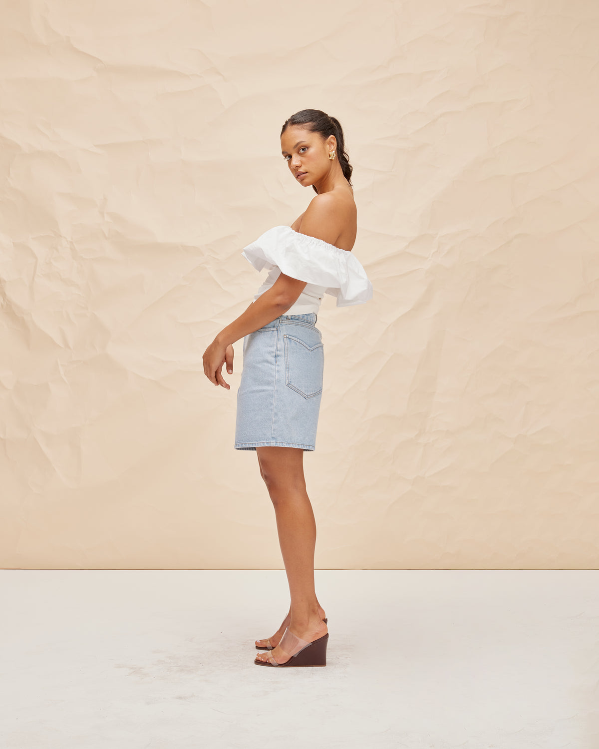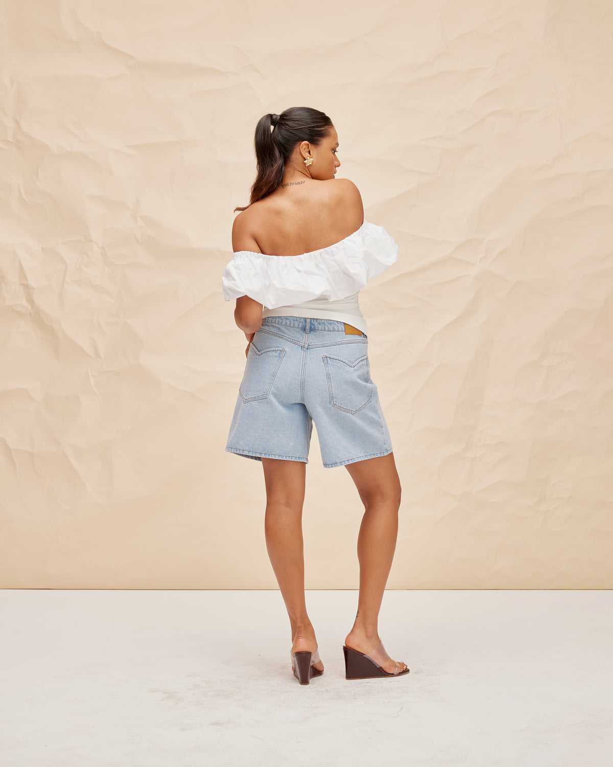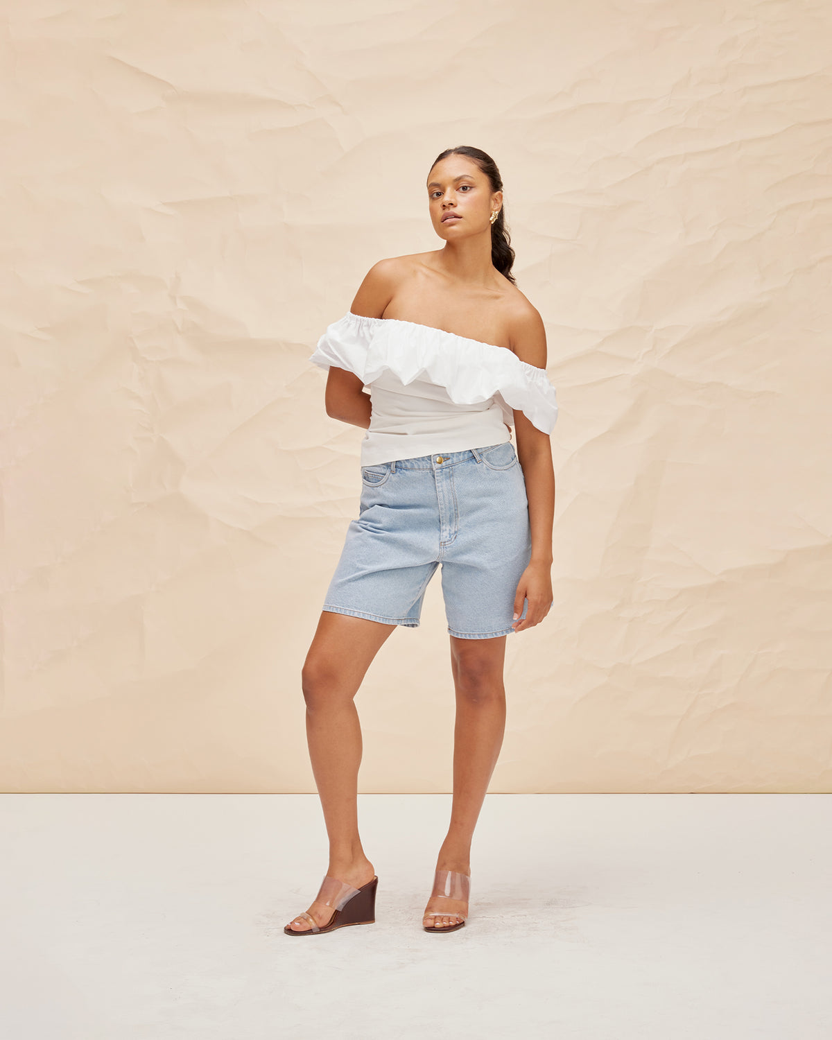 Vintage inspired highwaisted short designed in a stone wash mid-weight cotton denim. Sitting slightly A-line and offering a longer length fit, these shorts sit relaxed and easy in the warmer weather.
