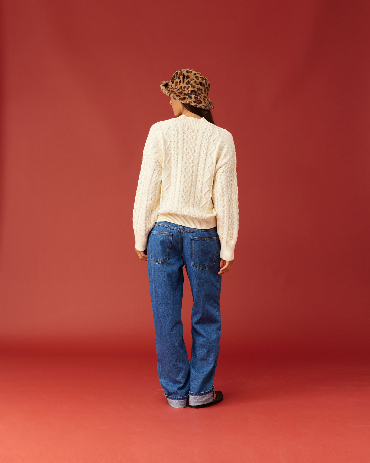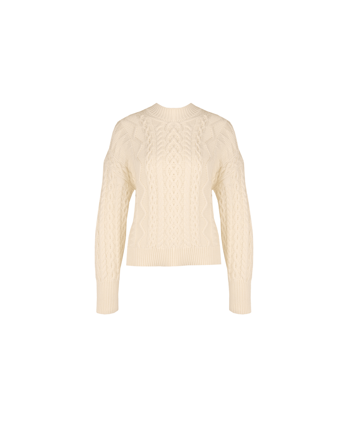 Chunky sweater in a luxe cable knit design. Features a mock neck with ribbing at the sleeve cuffs and neckline, this sweater is cosy and lush to wear.