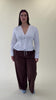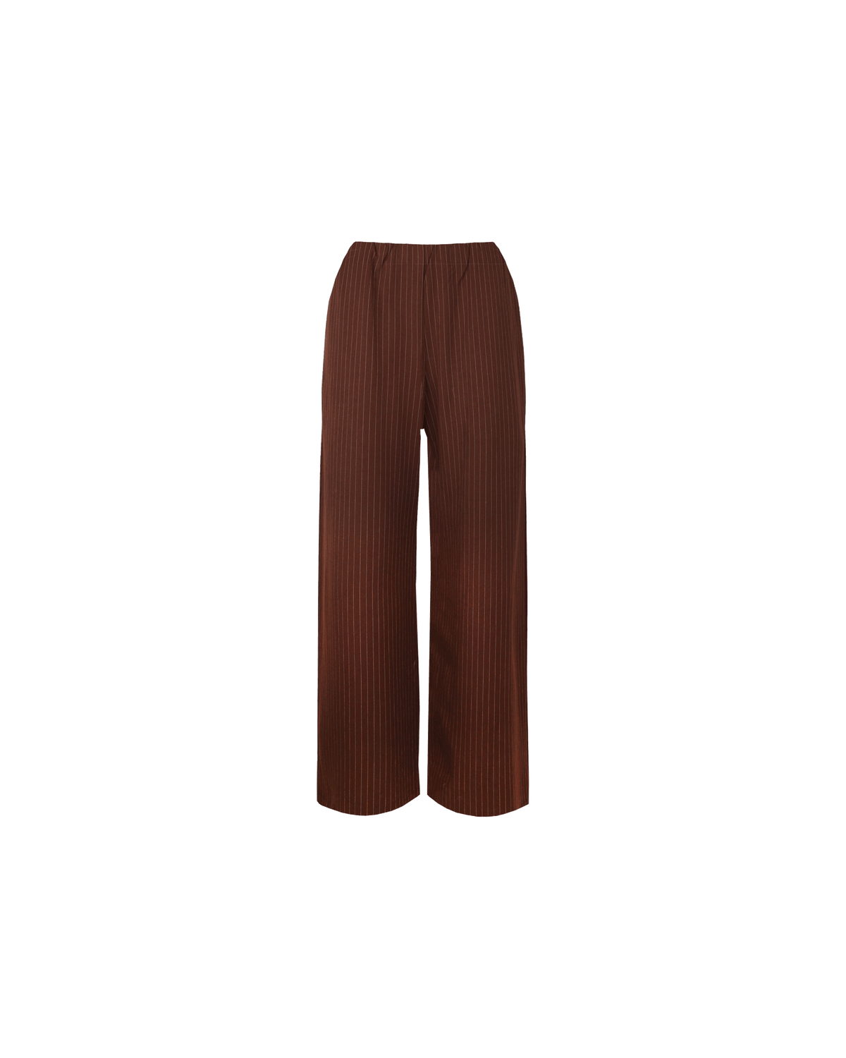 Straight leg pant with a flat elastic waistband, designed in brown pinstripe. These pants sit relaxed and wide and have side and back pockets.