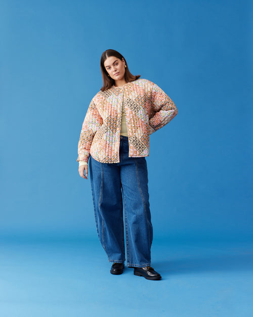 Quilted cotton jacket with a high crew neckline, designed in our RUBY pink patchwork print. Features peach coloured snap dome fastenings down the centre front and at the cuffs.
