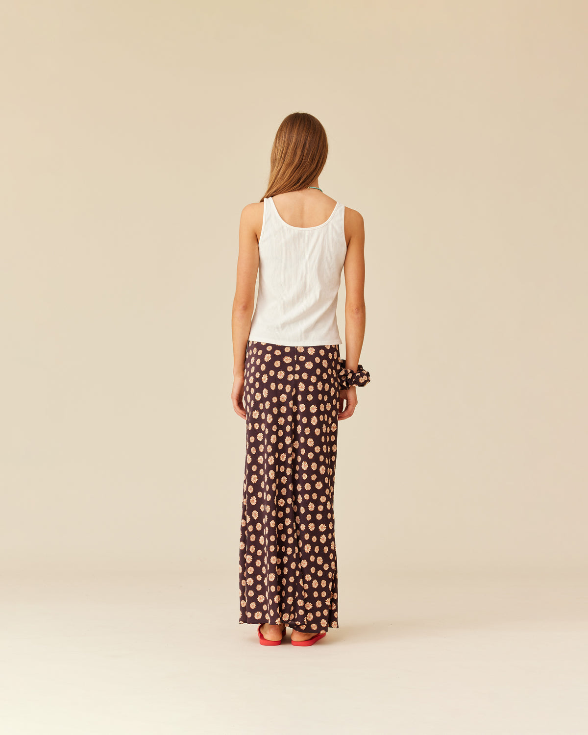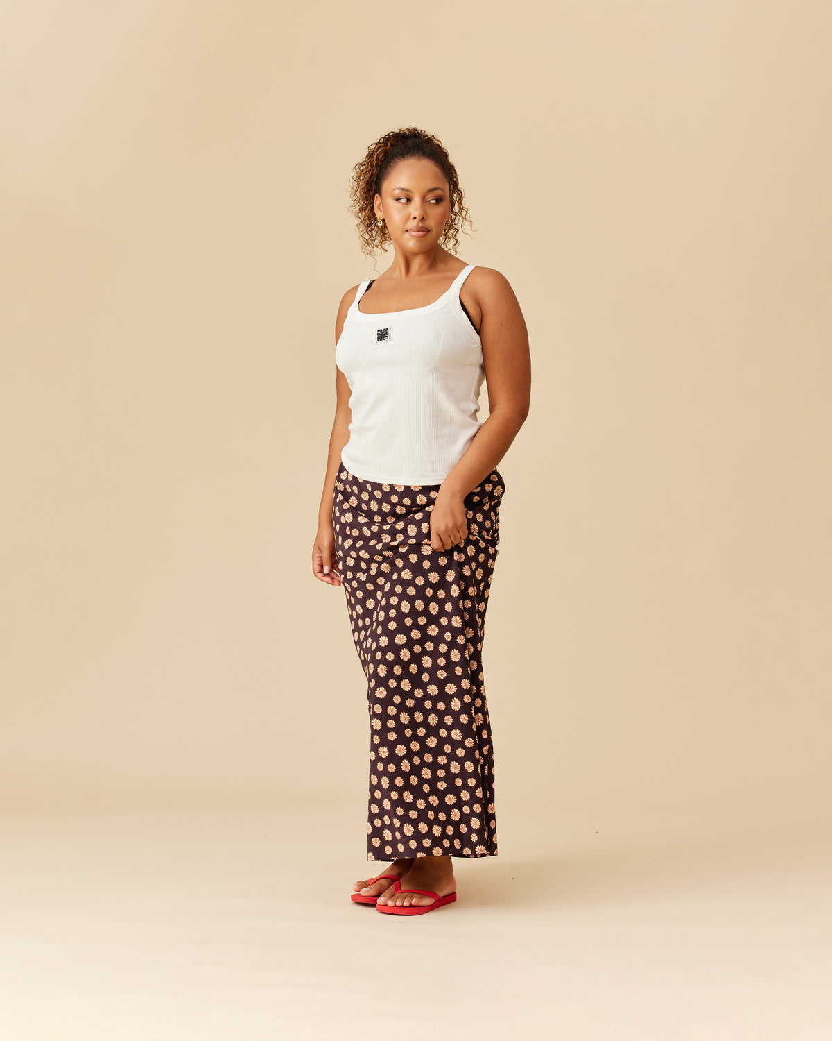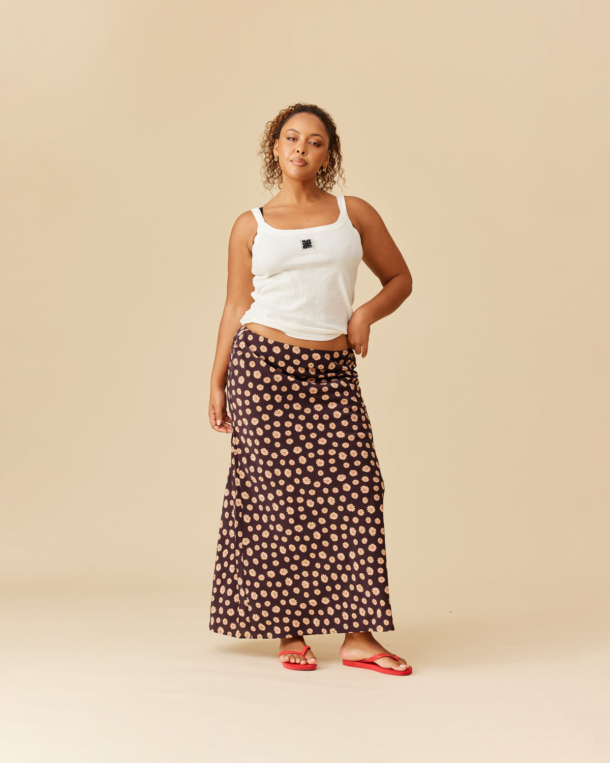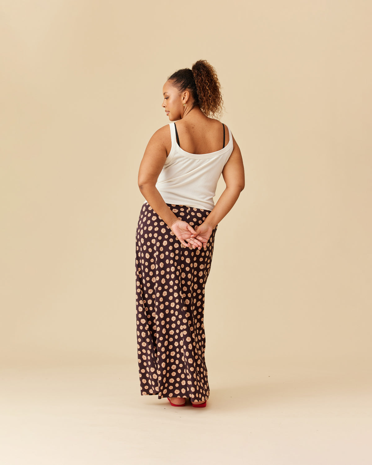 Flowing maxi skirt, designed in our brown ditzy print. With a soft vintage look, this is the perfect light-weight summer skirt.
