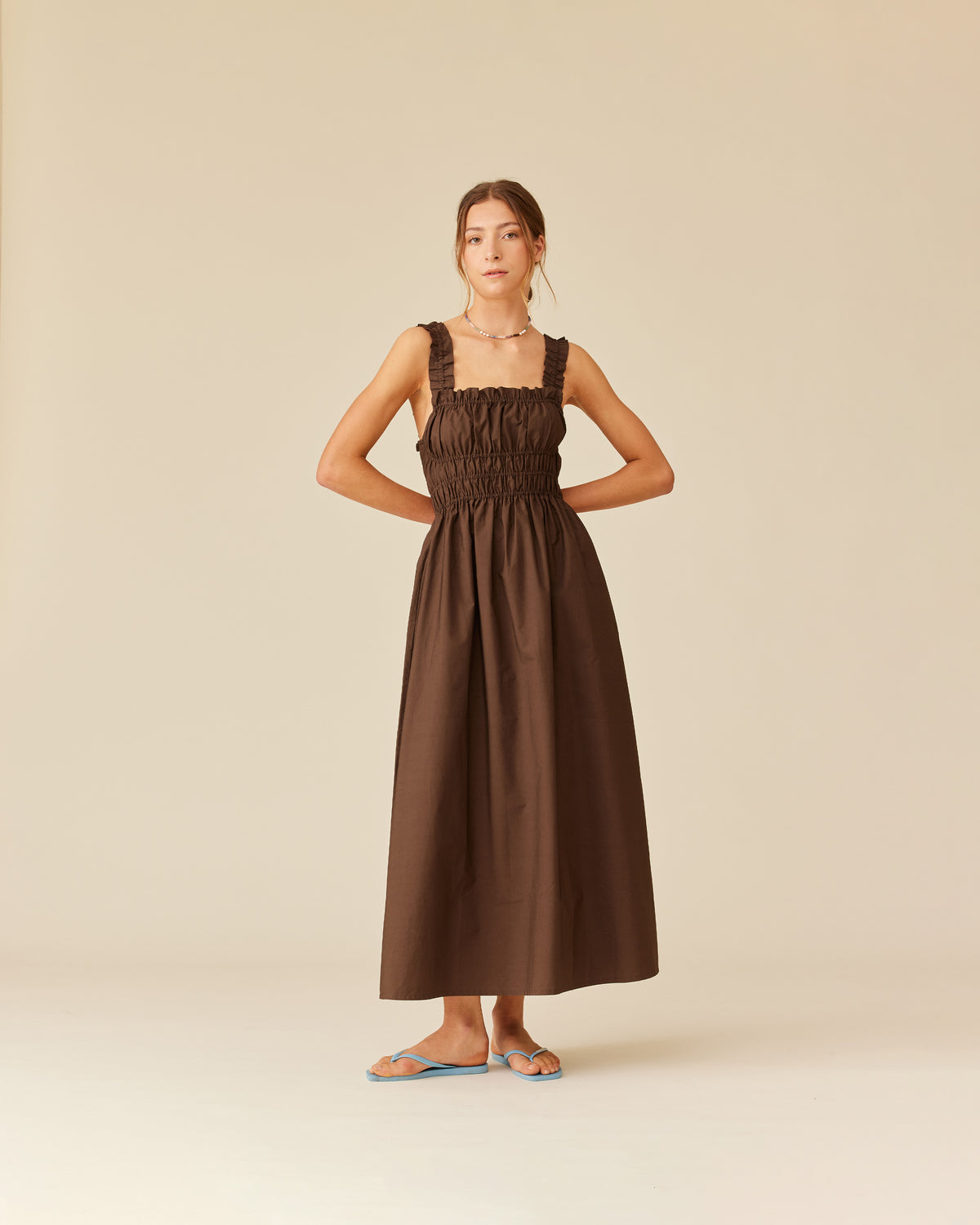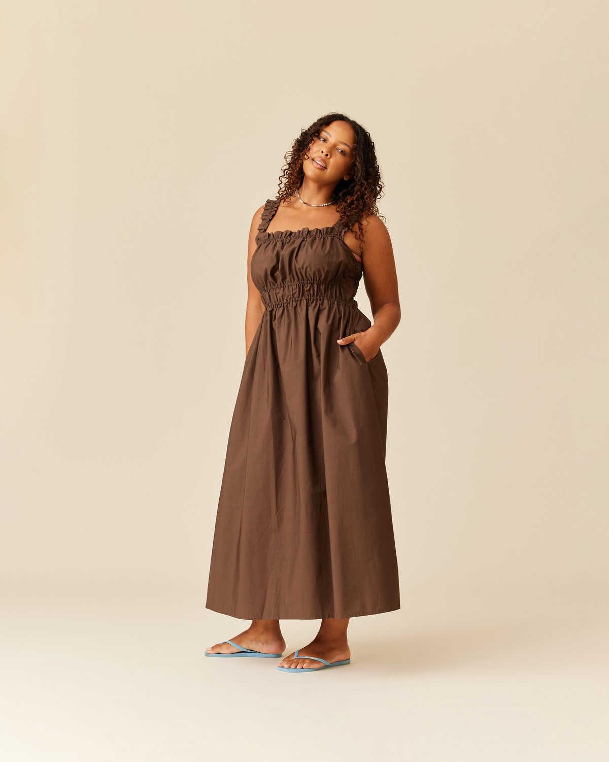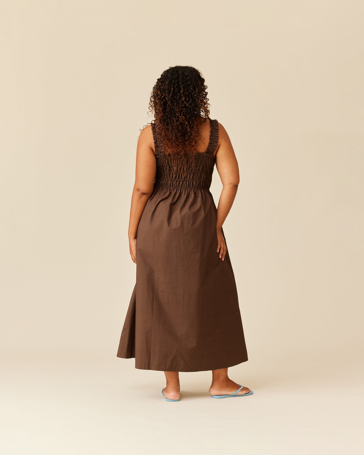 Sleeveless cotton midi dress with a square neckline and shirred bodice and straps. This dress falls to a full A-line skirt, that features pockets to house all your essentials.