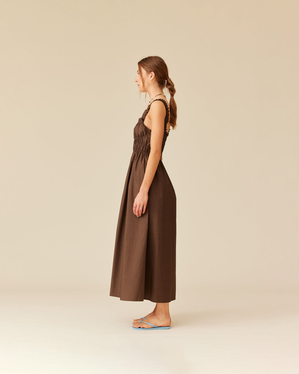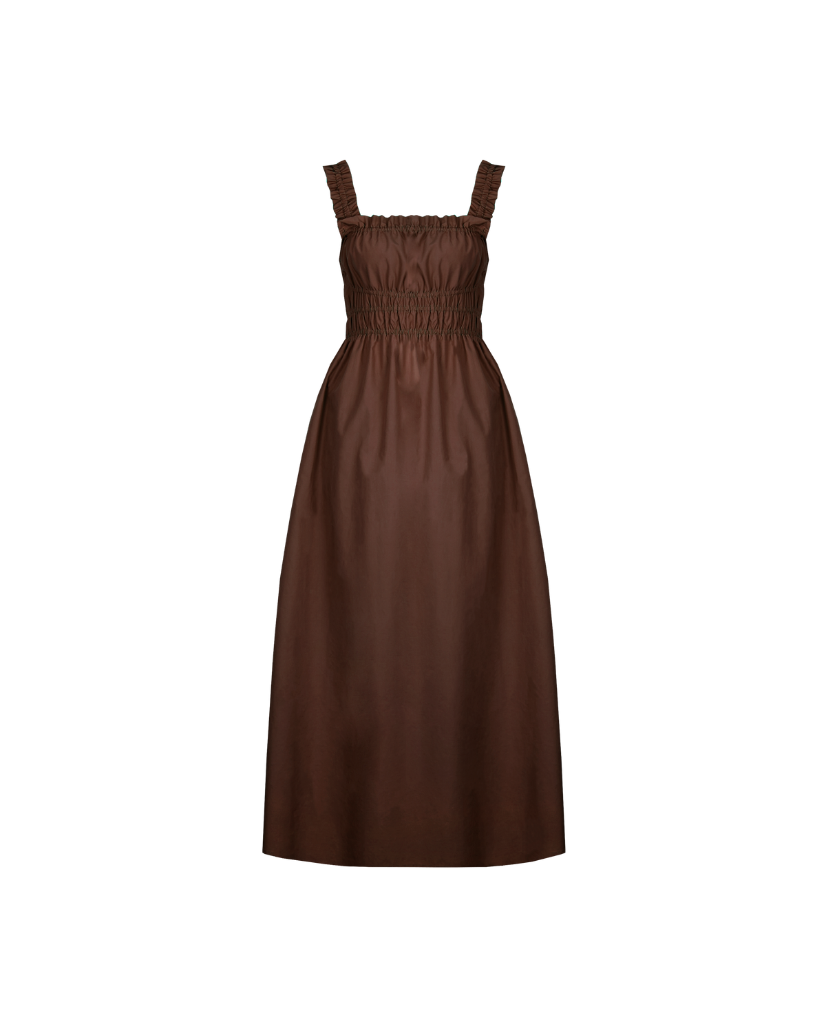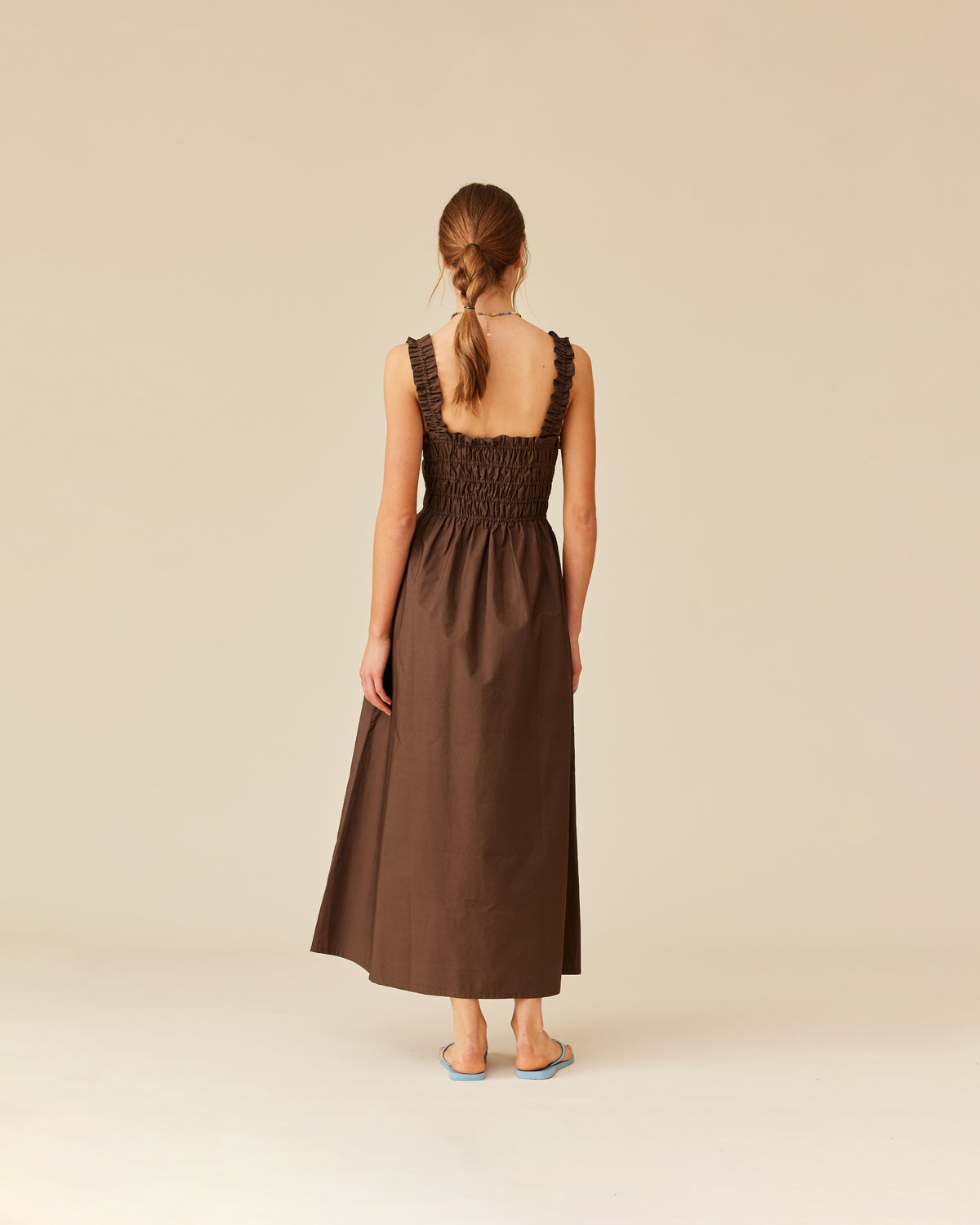 Sleeveless cotton midi dress with a square neckline and shirred bodice and straps. This dress falls to a full A-line skirt, that features pockets to house all your essentials.