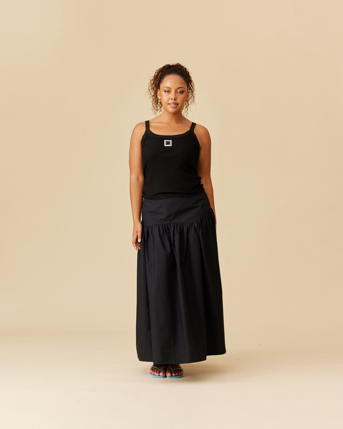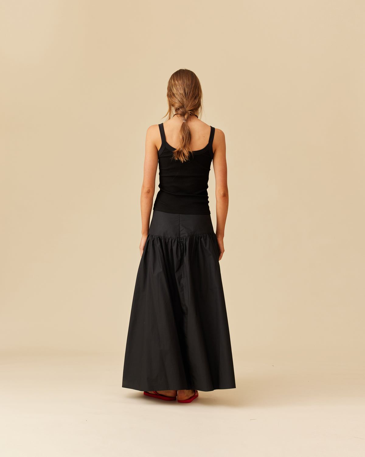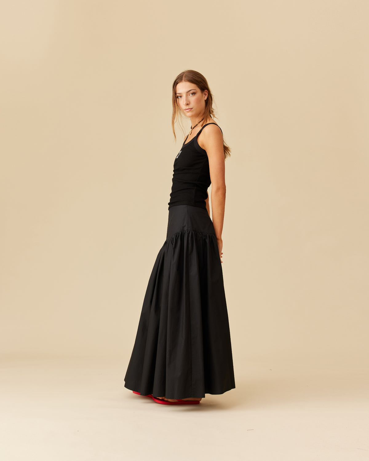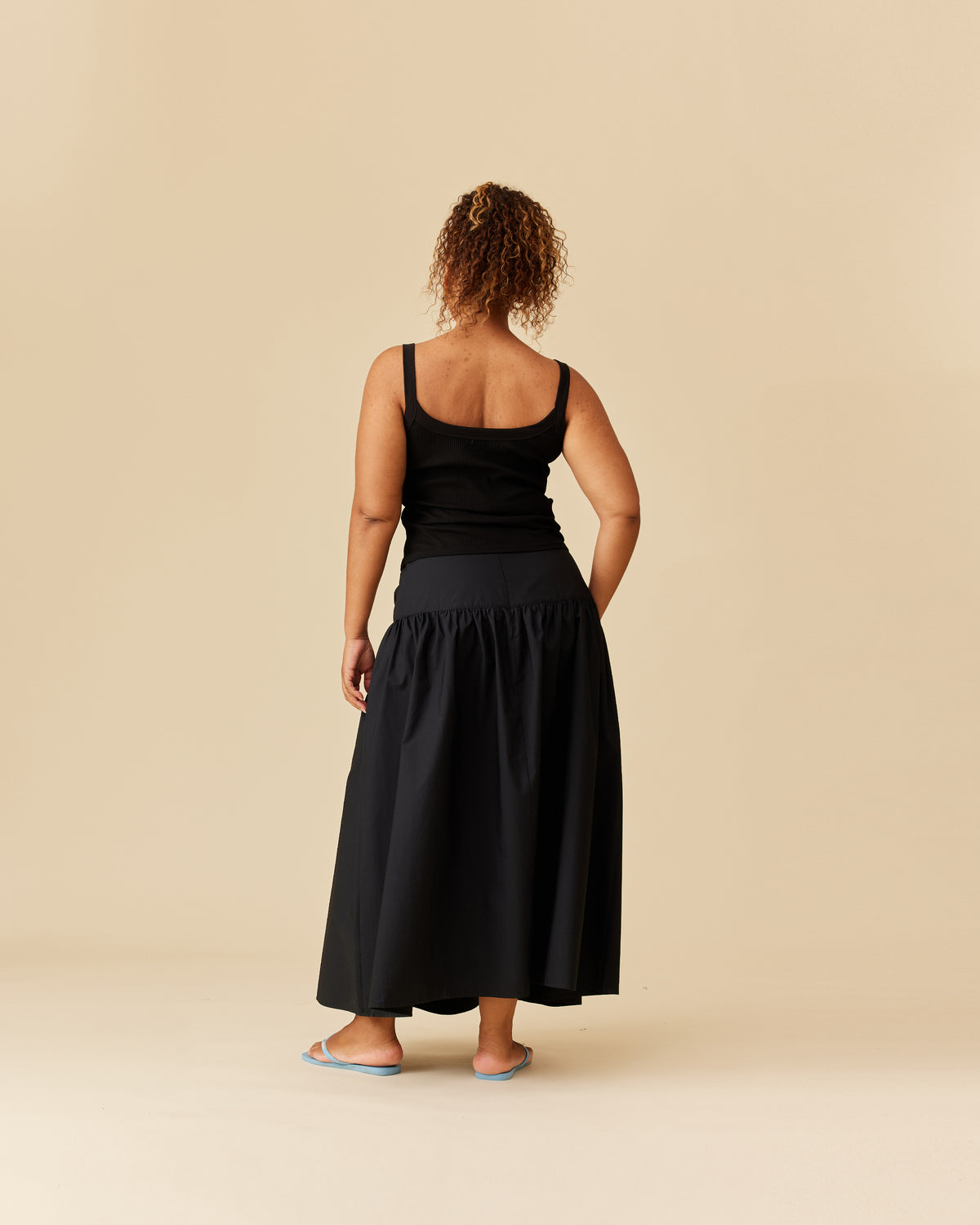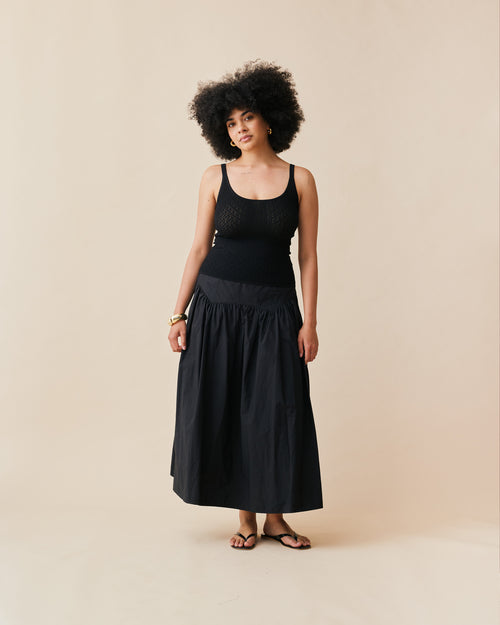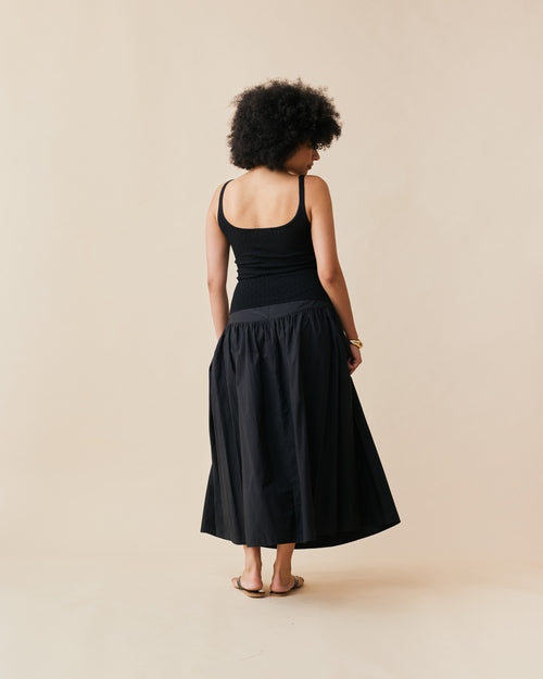 Floaty basque style maxi skirt imagined in a black cotton poplin fabric. This skirt features a bodice-style waistline, that falls to a full, wide skirt.