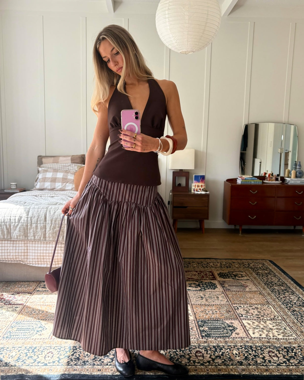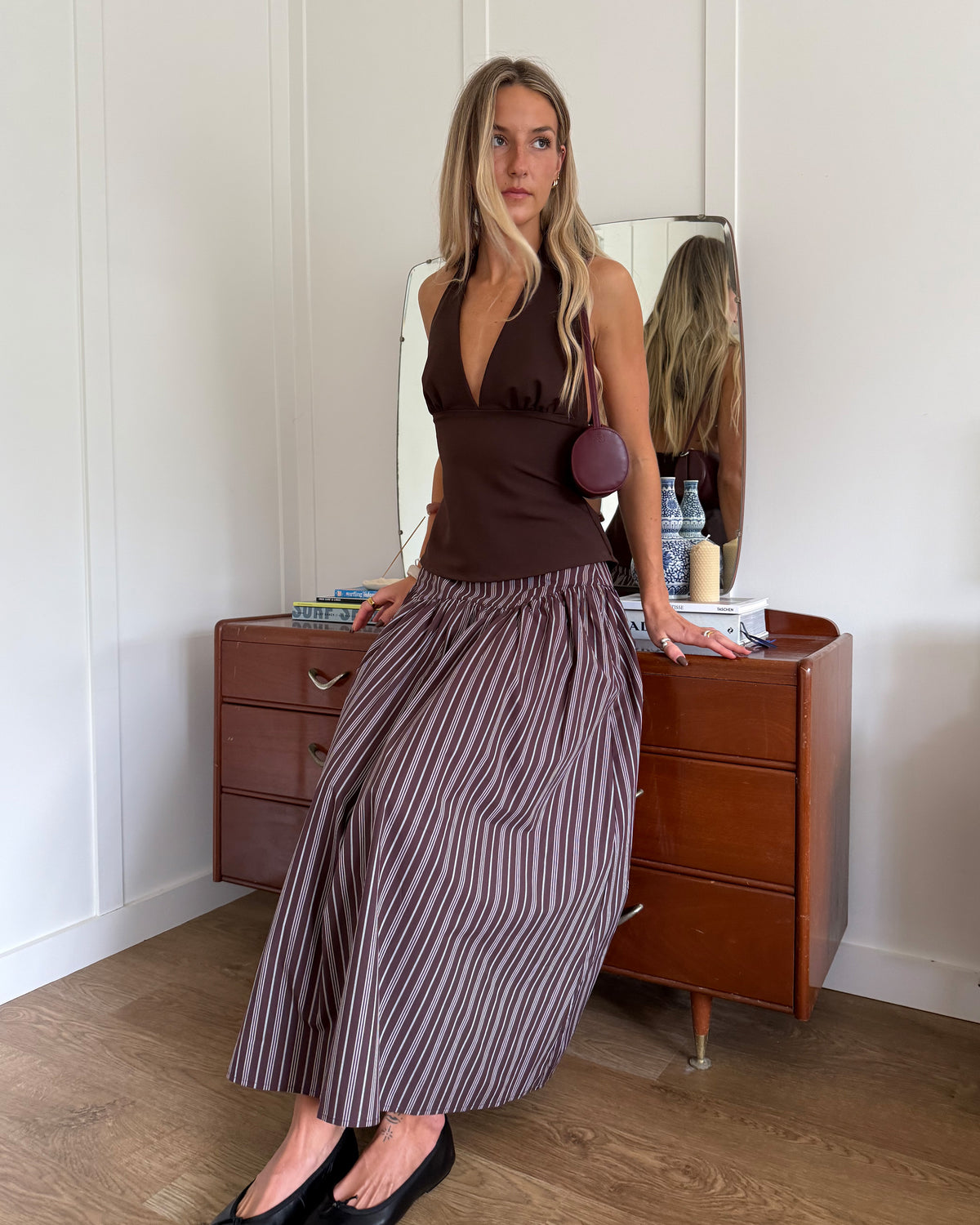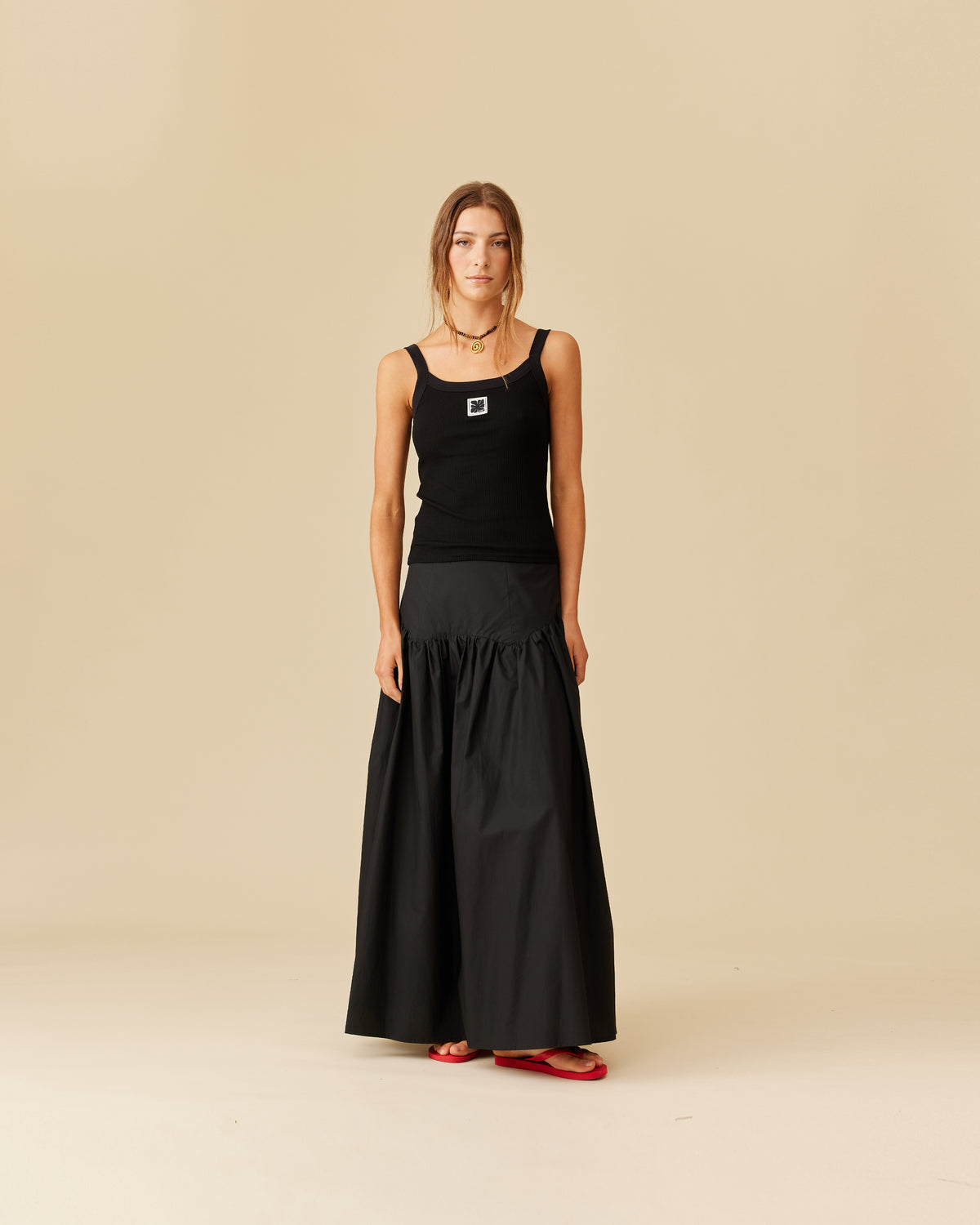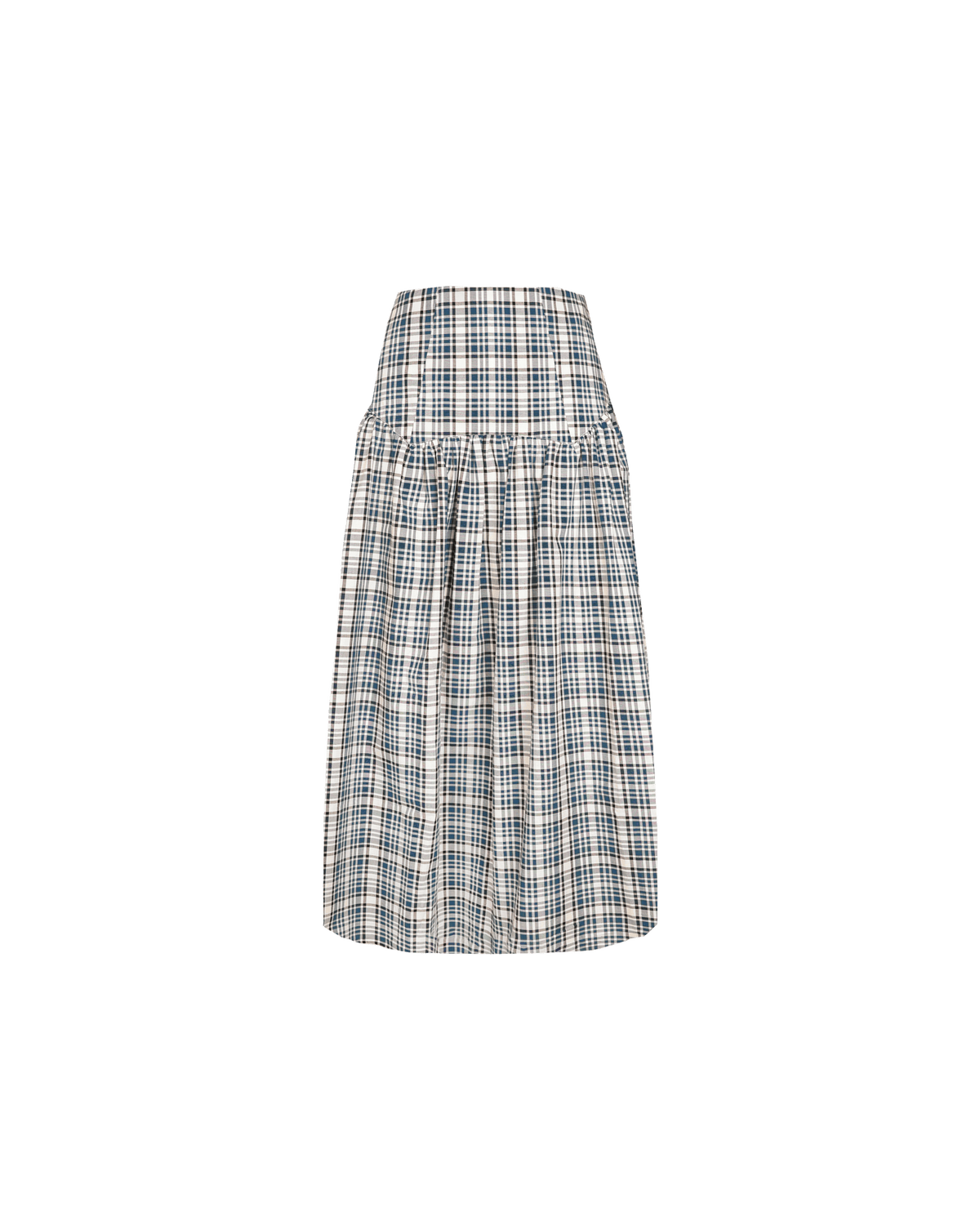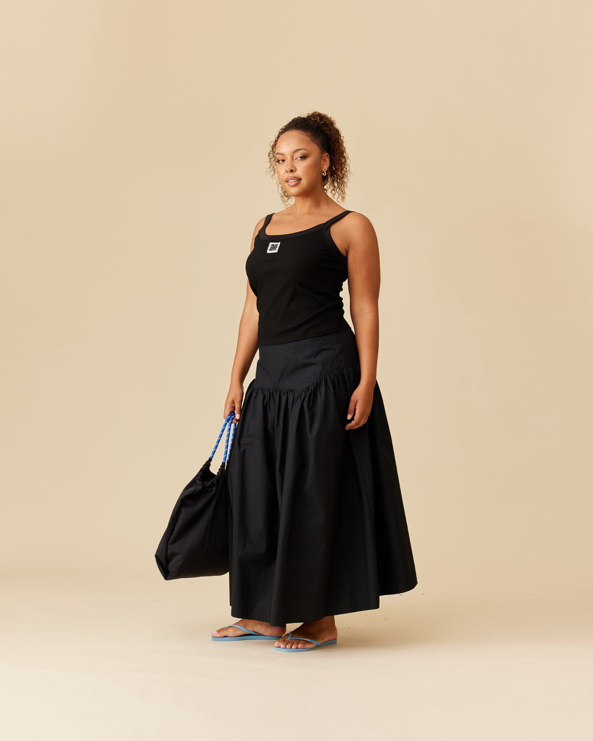 Floaty basque style maxi skirt imagined in a black cotton poplin fabric. This skirt features a bodice-style waistline, that falls to a full, wide skirt.