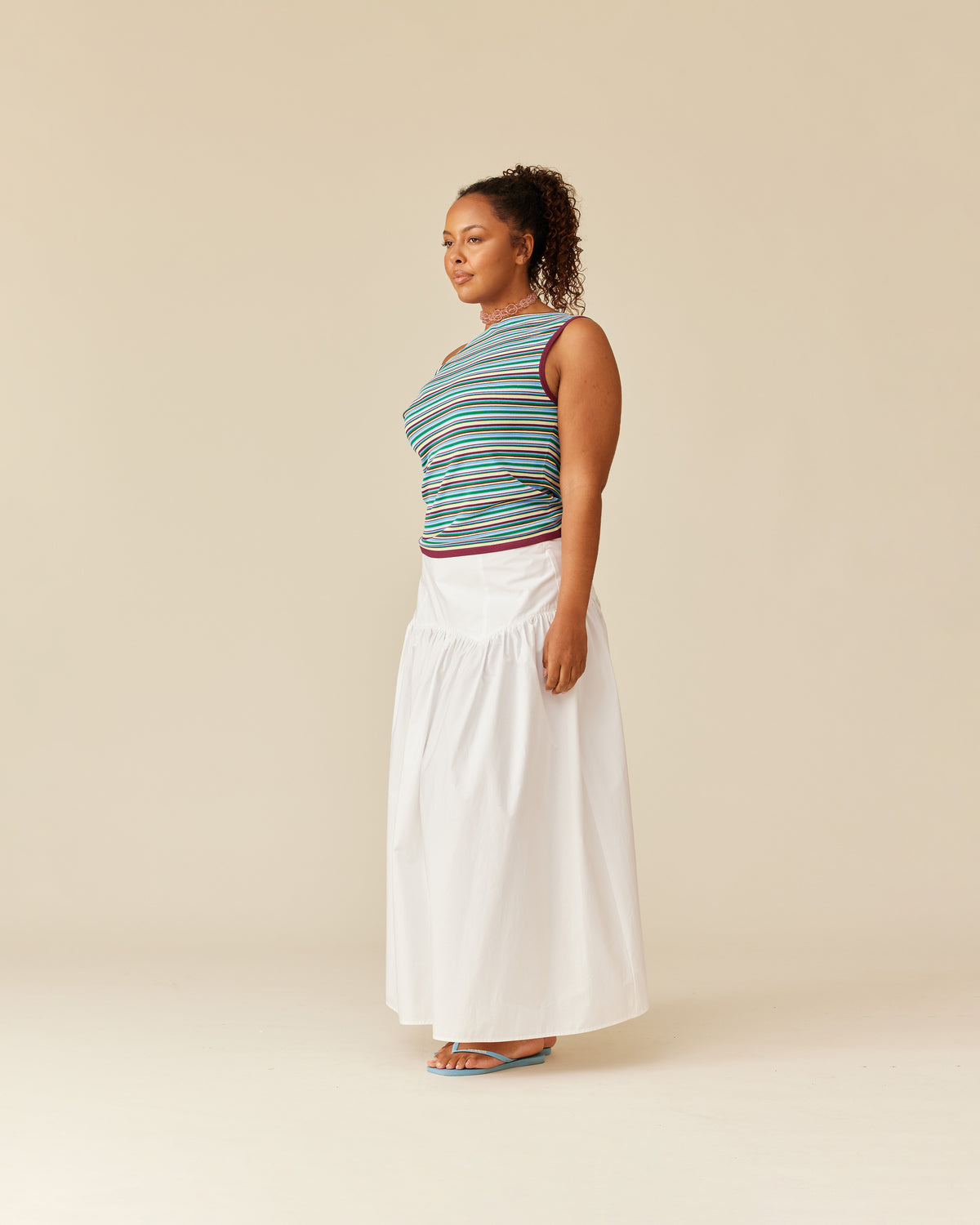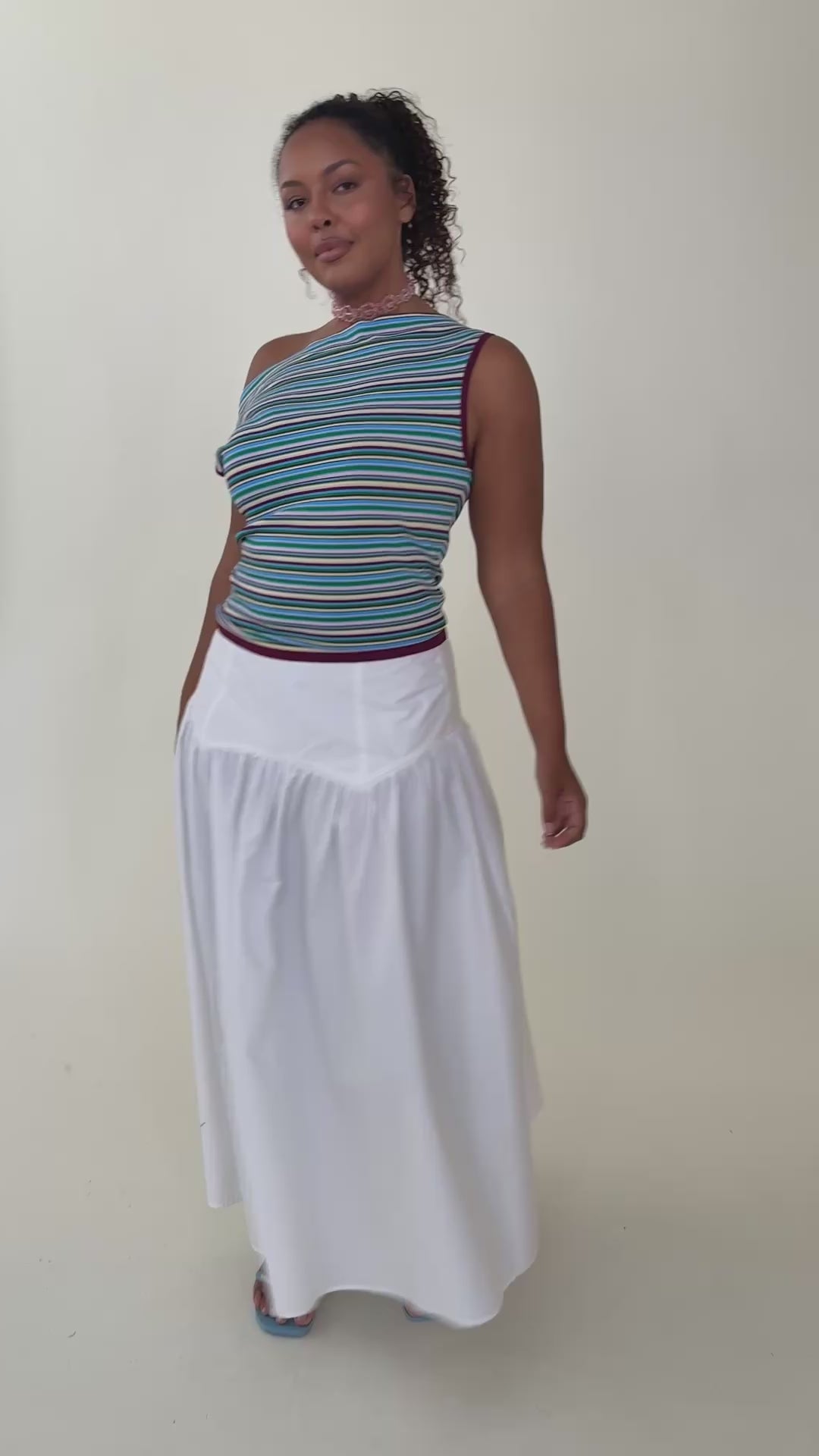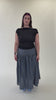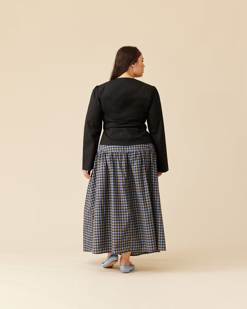 Floaty basque style maxi skirt imagined in a black tartan cotton. This skirt features a dropped bodice style waistline, that falls to a full, wide skirt.