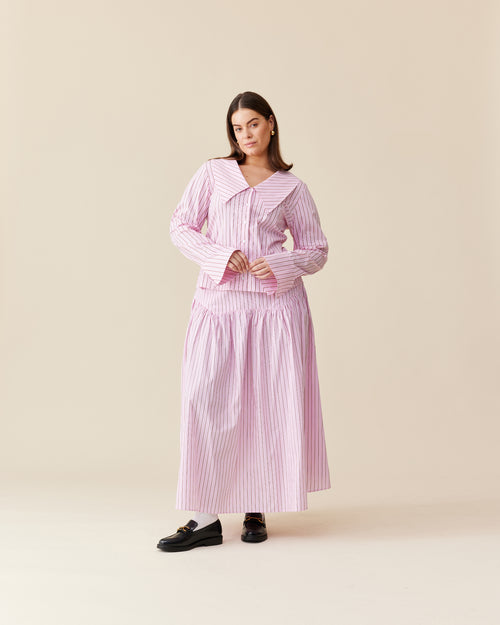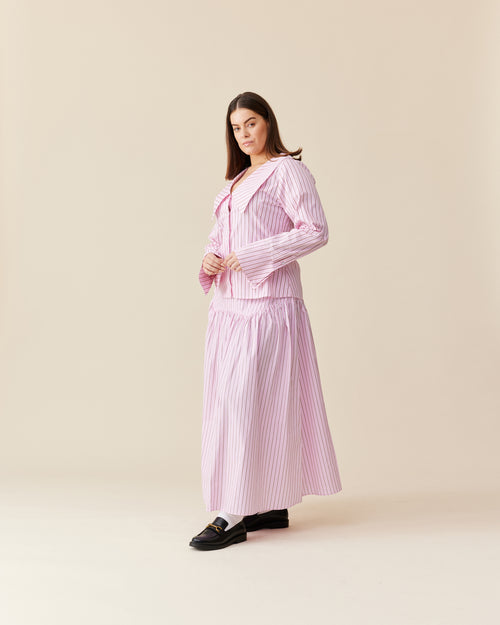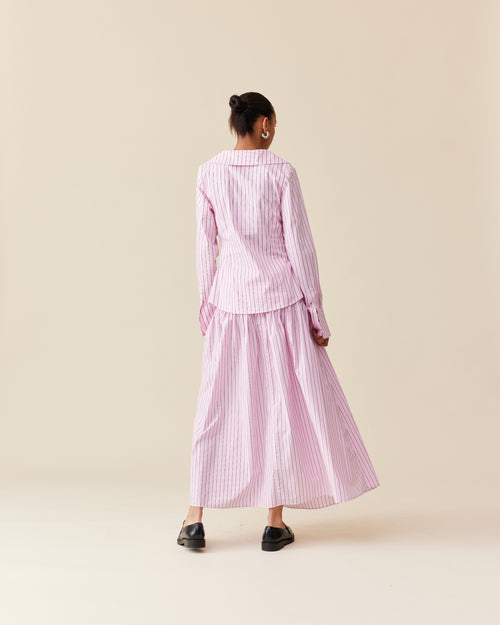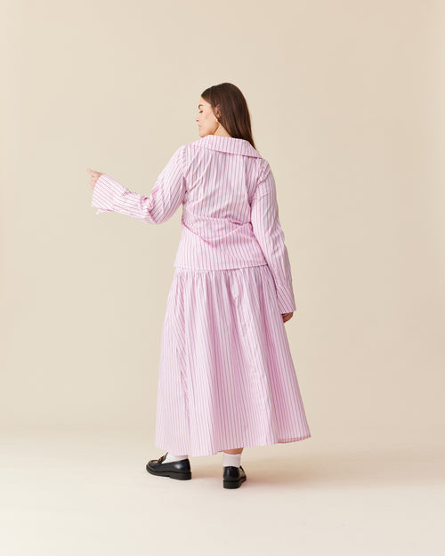 Floaty basque style maxi skirt imagined in a pink striped cotton. This skirt features an asymmetrical bodice-style waistline, that falls to a full, wide skirt.