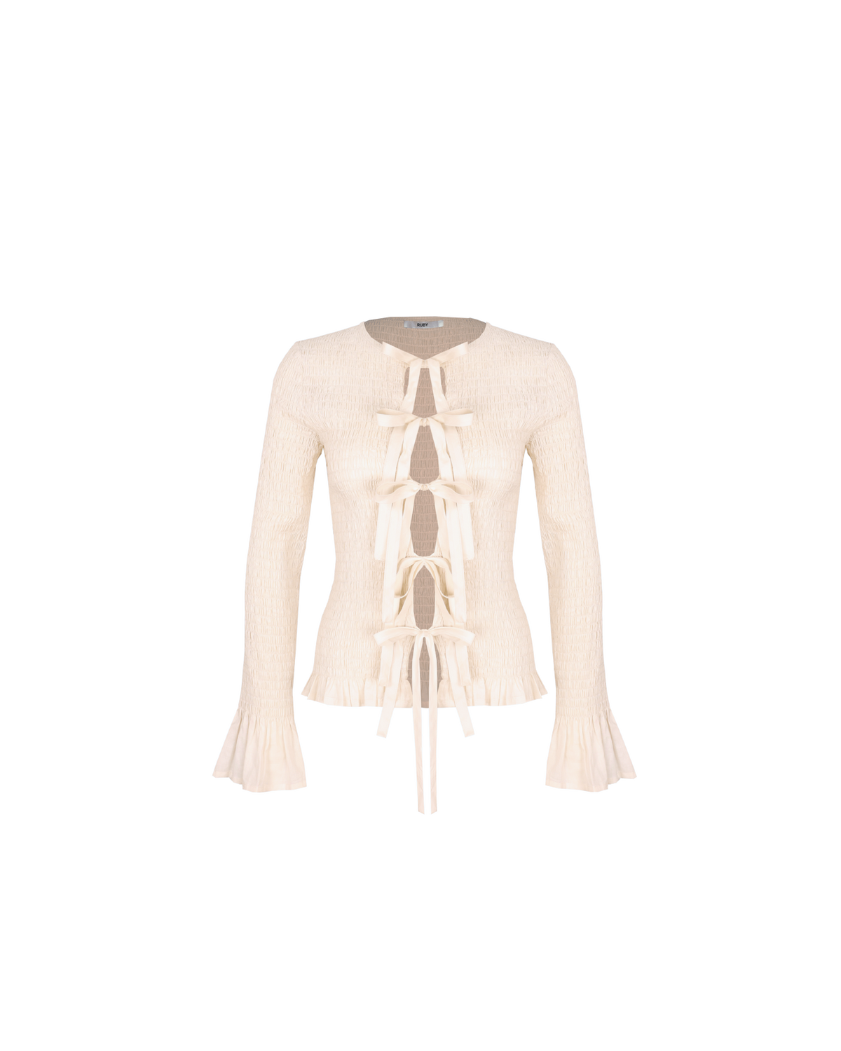 Long sleeve shirred top, with tie closures down the centre front. This top is designed in a luxe ivory shade, making it the perfect piece to take from day to night.