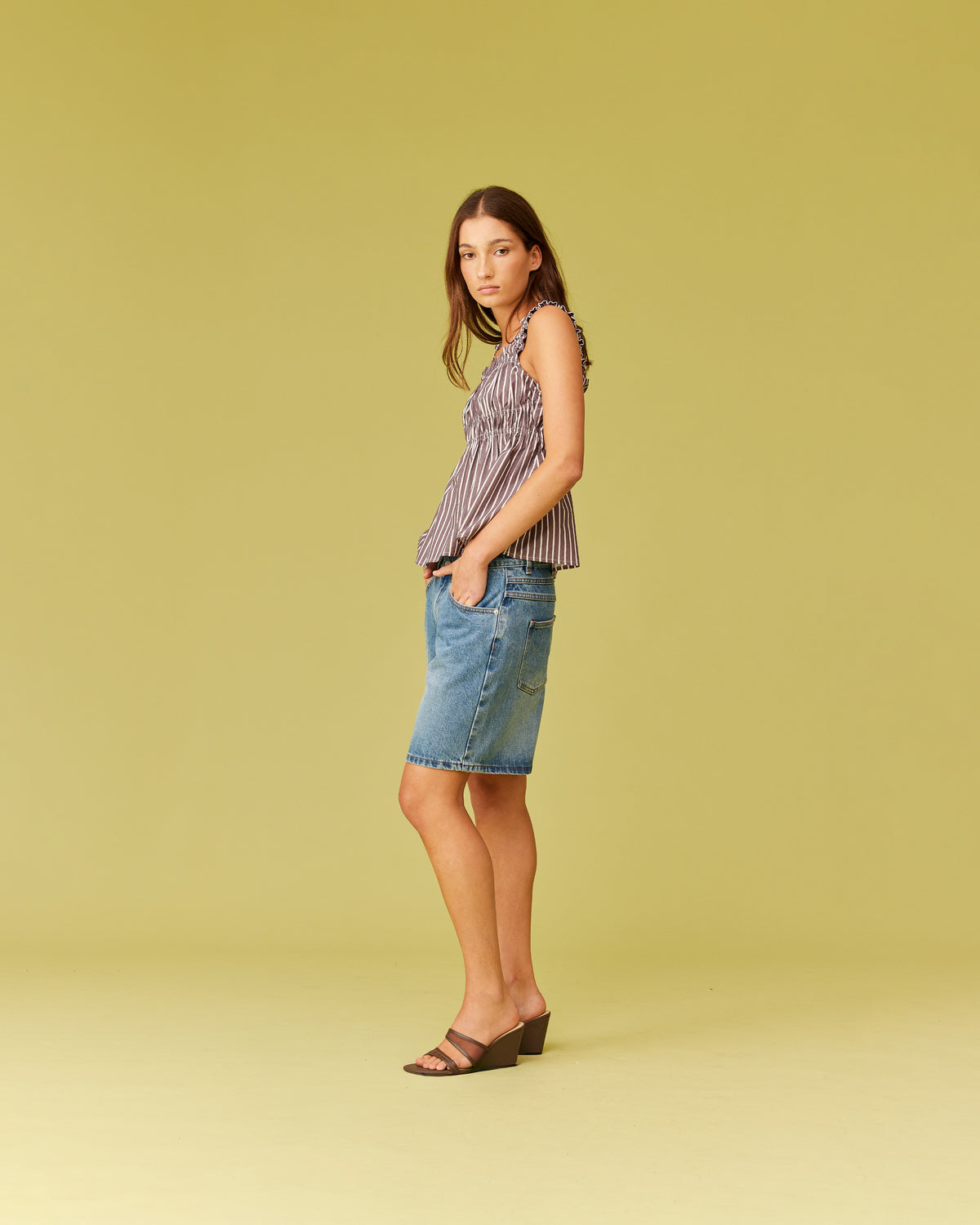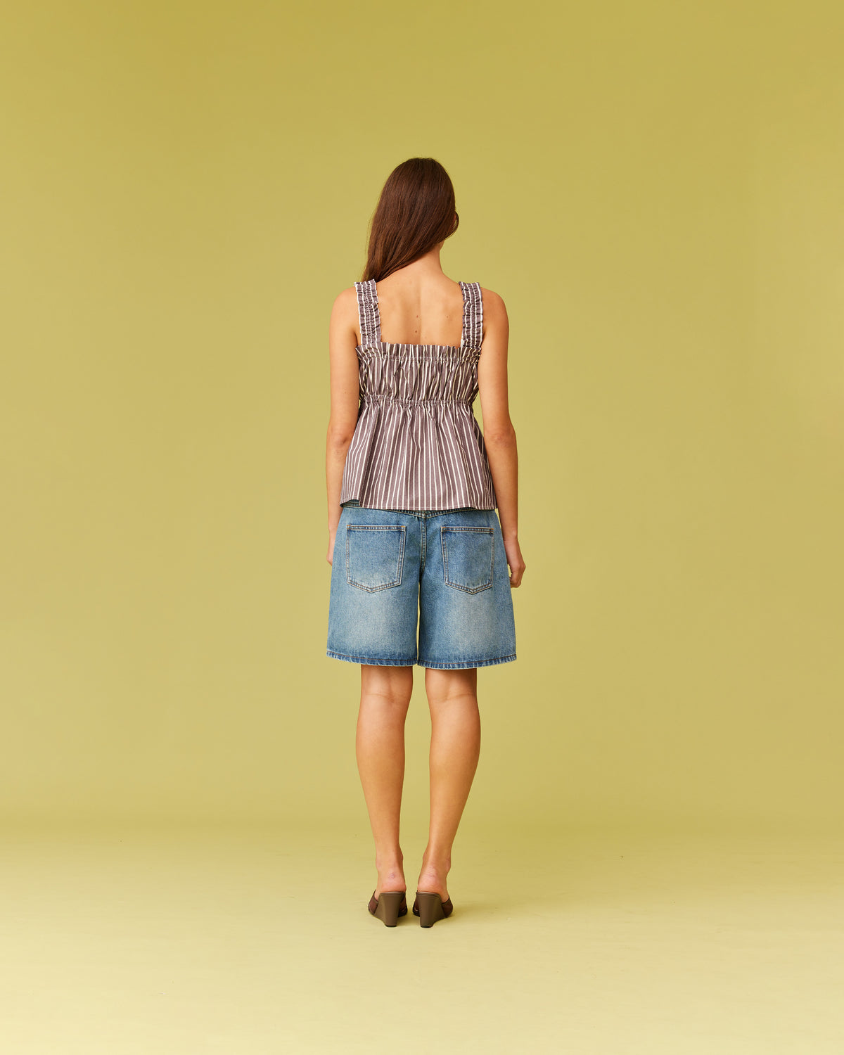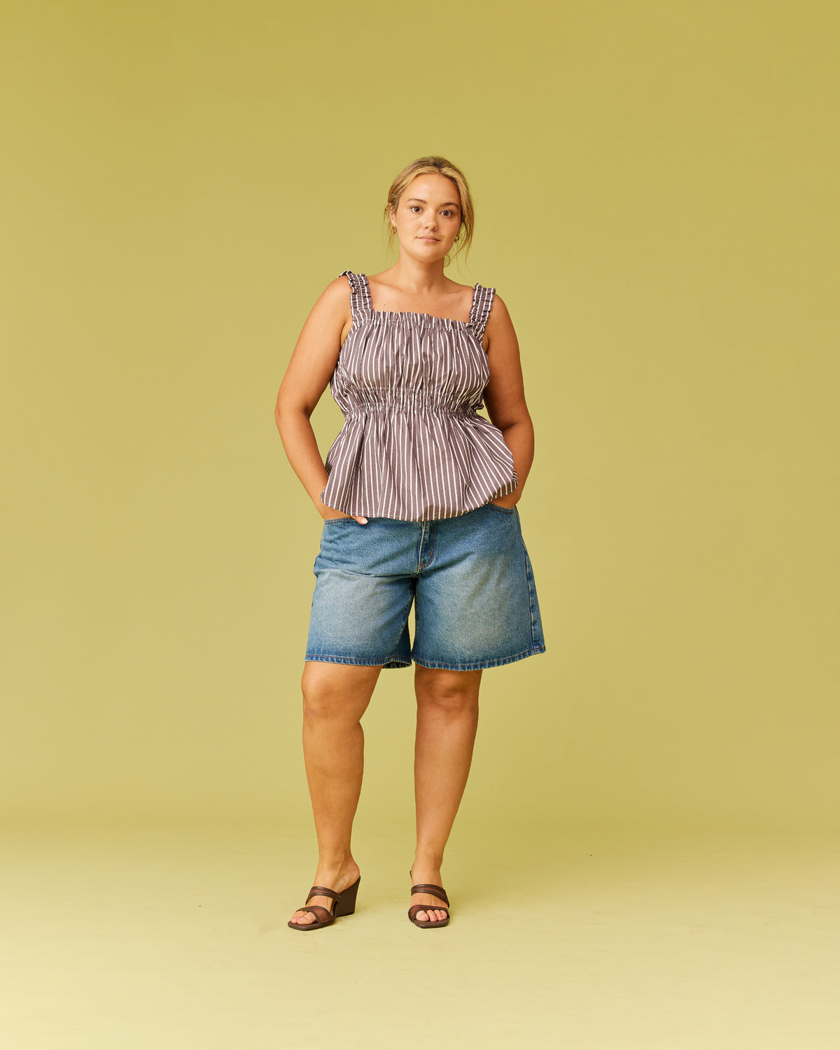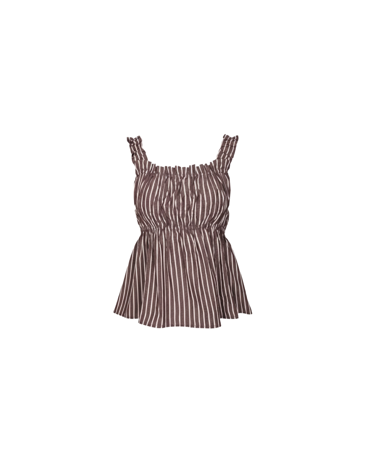 Sleeveless cotton top with a square neckline. This top falls to a full A-line shape and has shirring through the bust and straps for an accommodating fit.