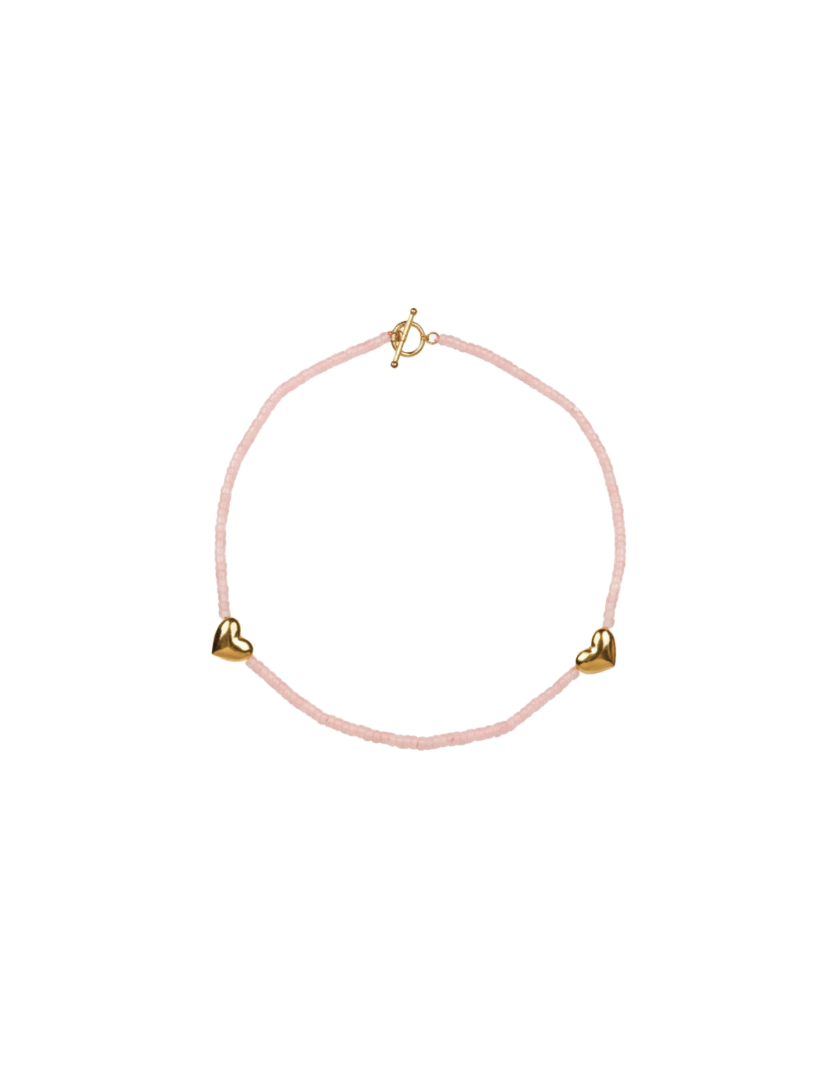 Pink turquoise beaded necklace with two feature gold heart beads. The length sits short, on the collar bones.