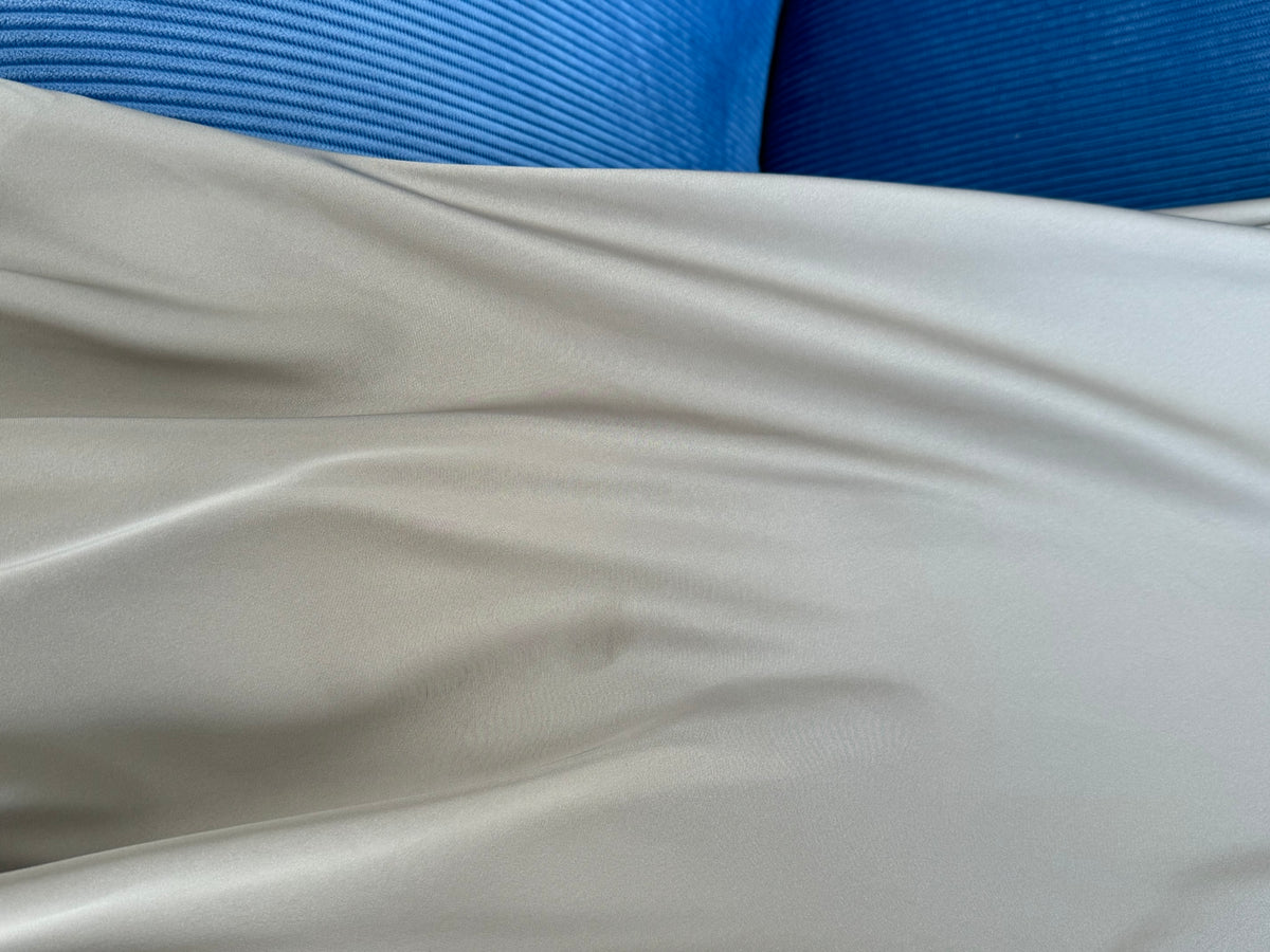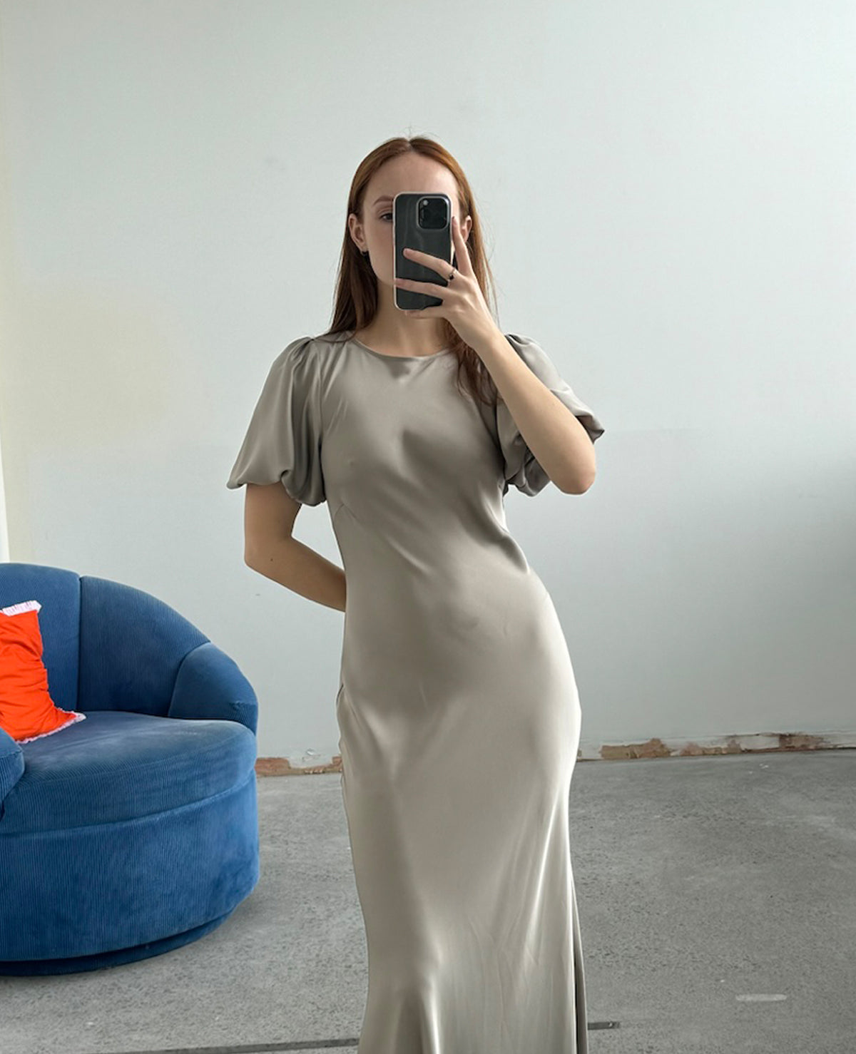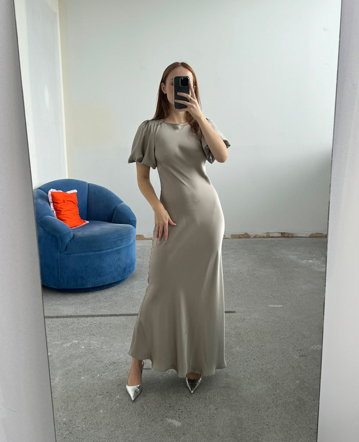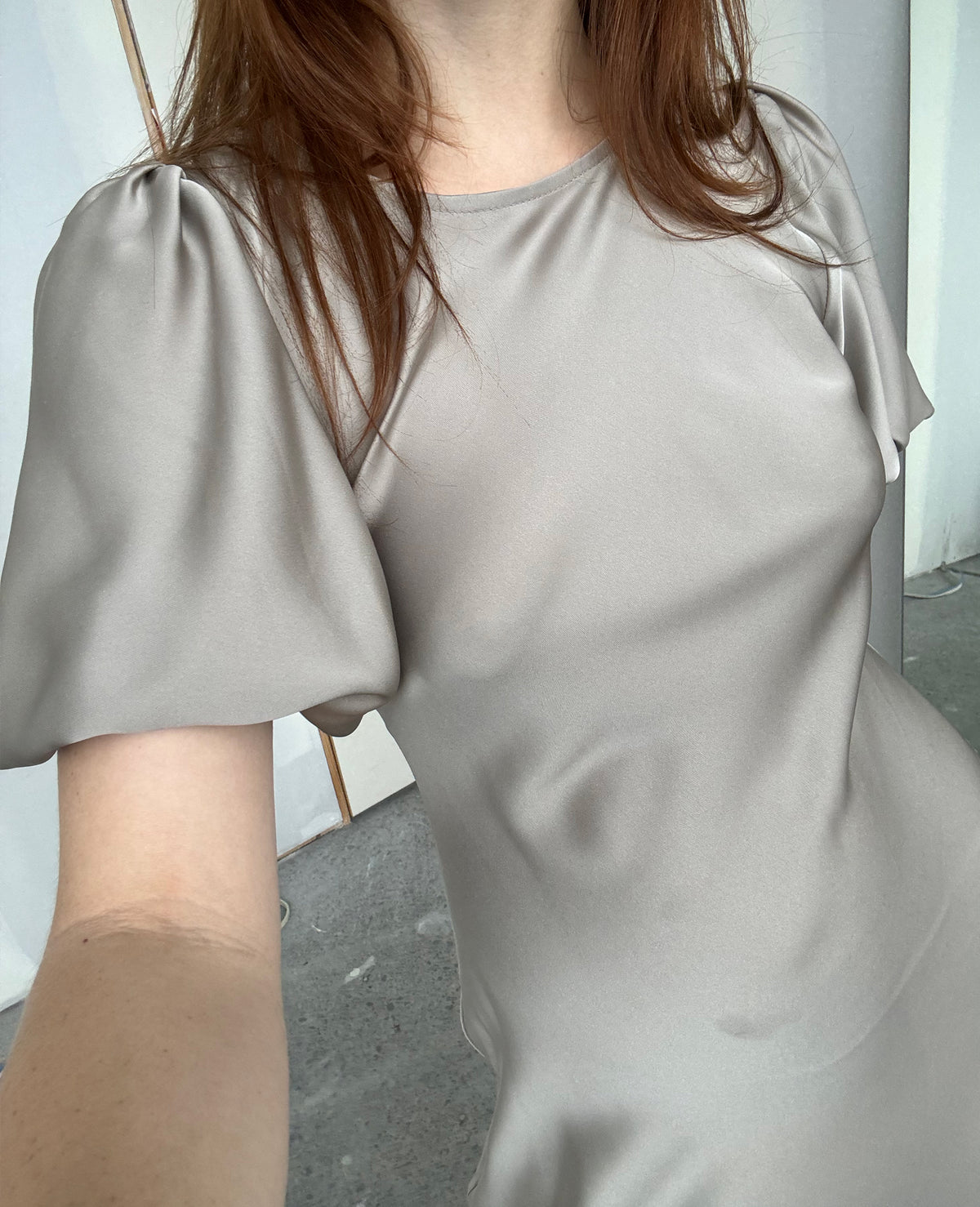 Bias cut satin midi dress with puff sleeves and a keyhole button closure at the back neck. The bias silhouette of this dress gently contours the body, while the moonrock coloured satin provides a soft sheen to the piece. Find out more about this garments quirk below.