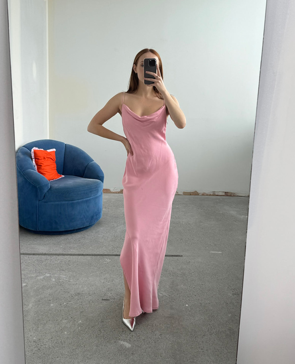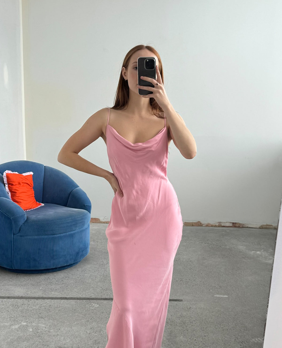 Statuesque maxi dress with a cowl neckline and adjustable spaghetti straps, imagined in a luxurious bubblegum cupro. This piece is cut on the bias to accentuate the figure-skimming fit. Find out more about this garments quirk below.