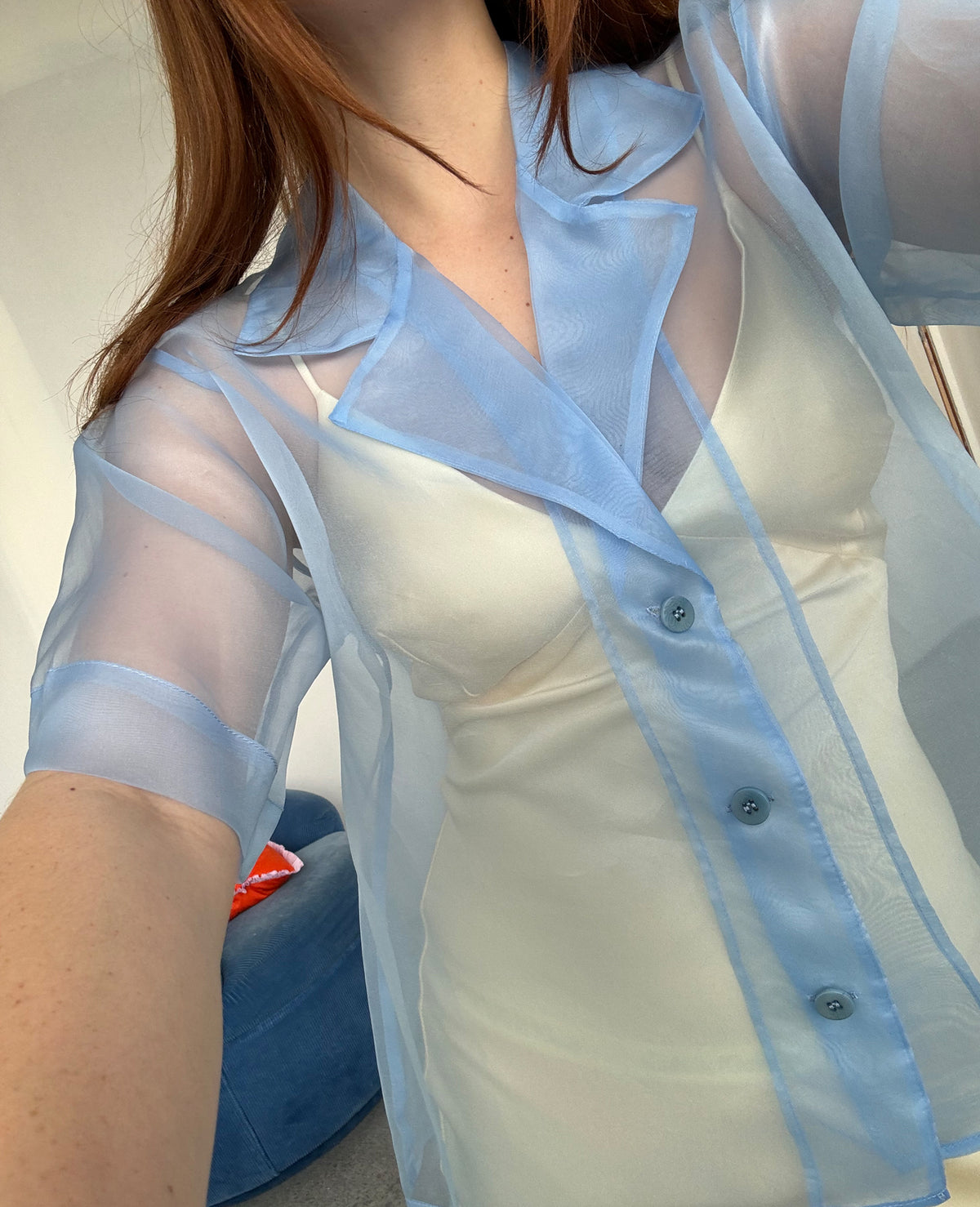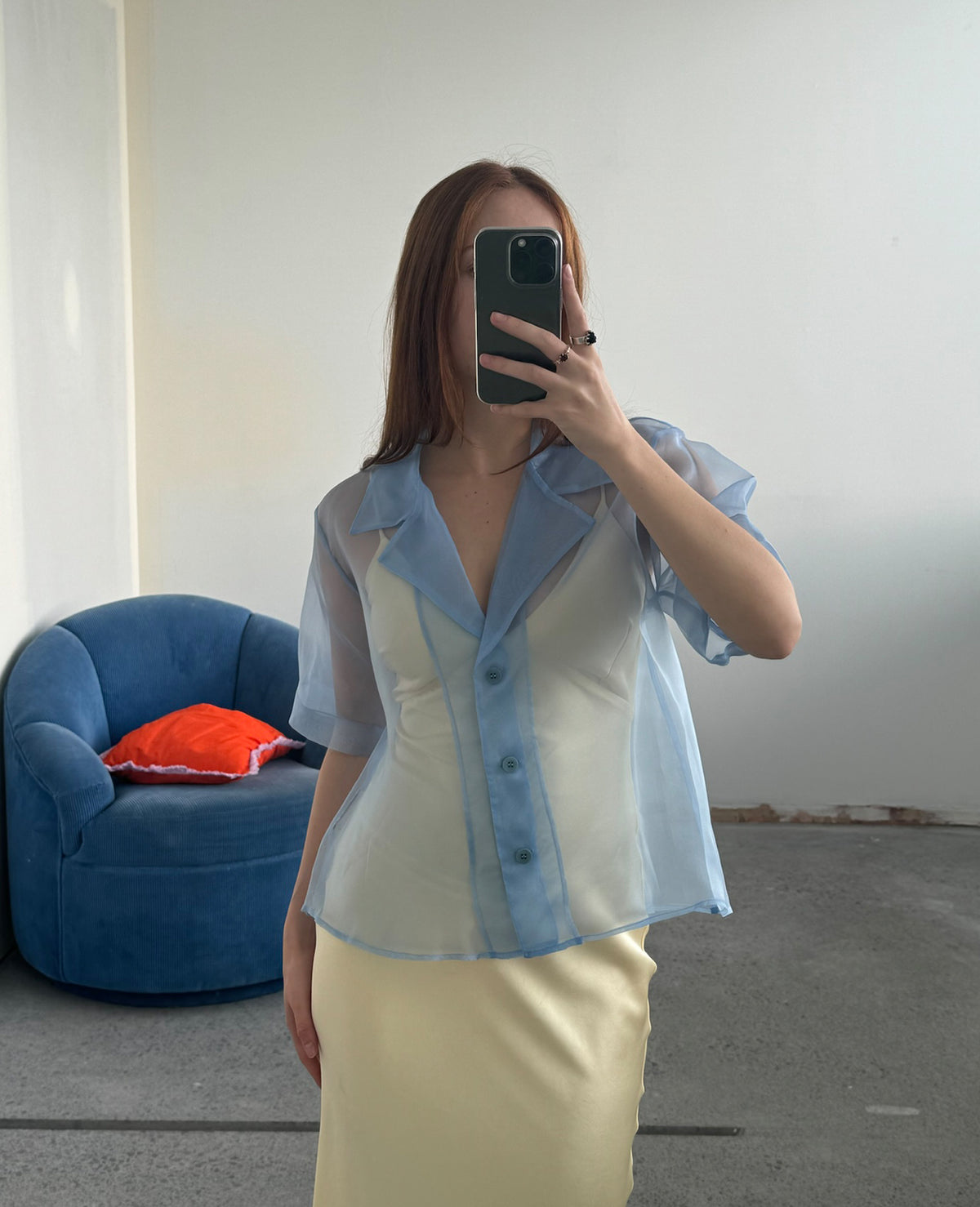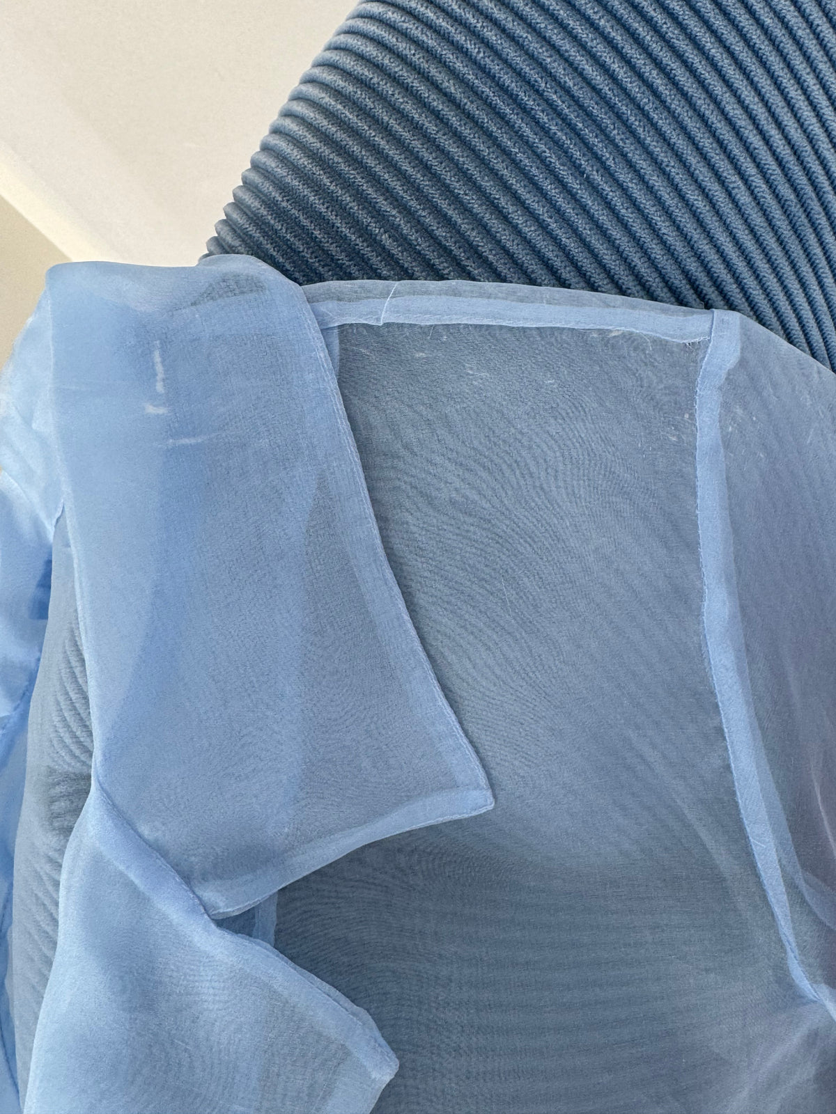 Boxy fit sheer shirt crafted in a sky coloured organza silk. This shirt offers a pop of colour while being a light layering piece. Find out more about this garments quirk below.