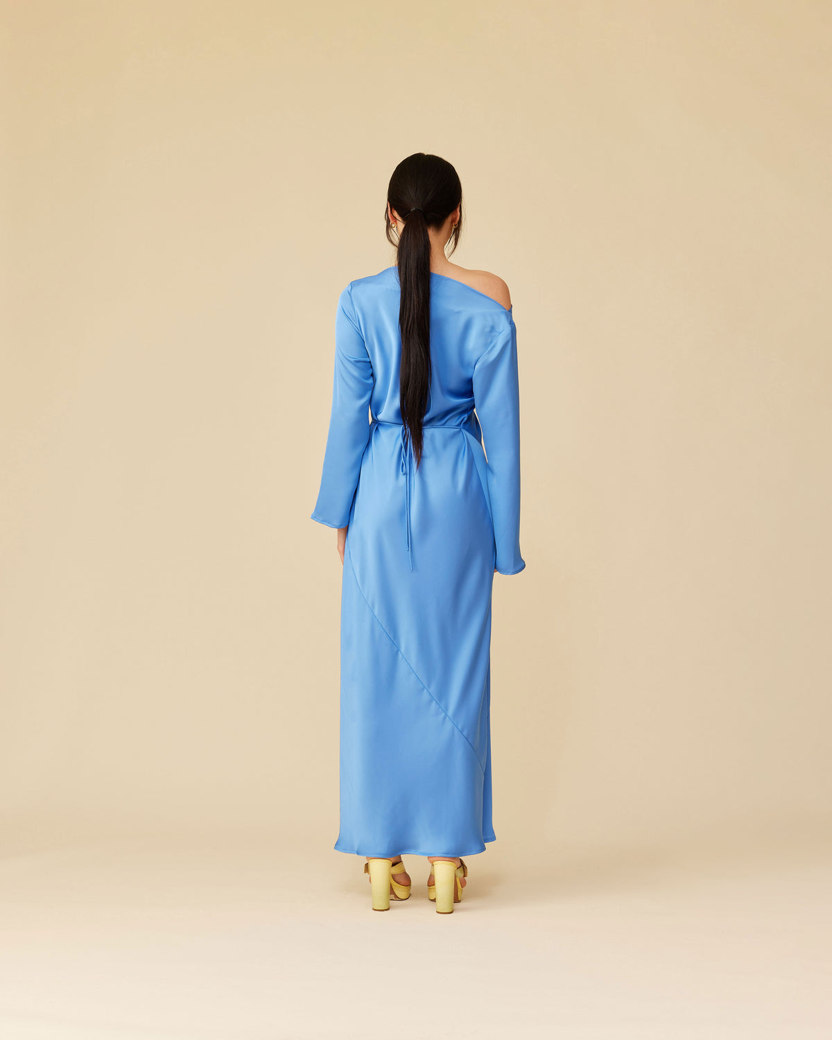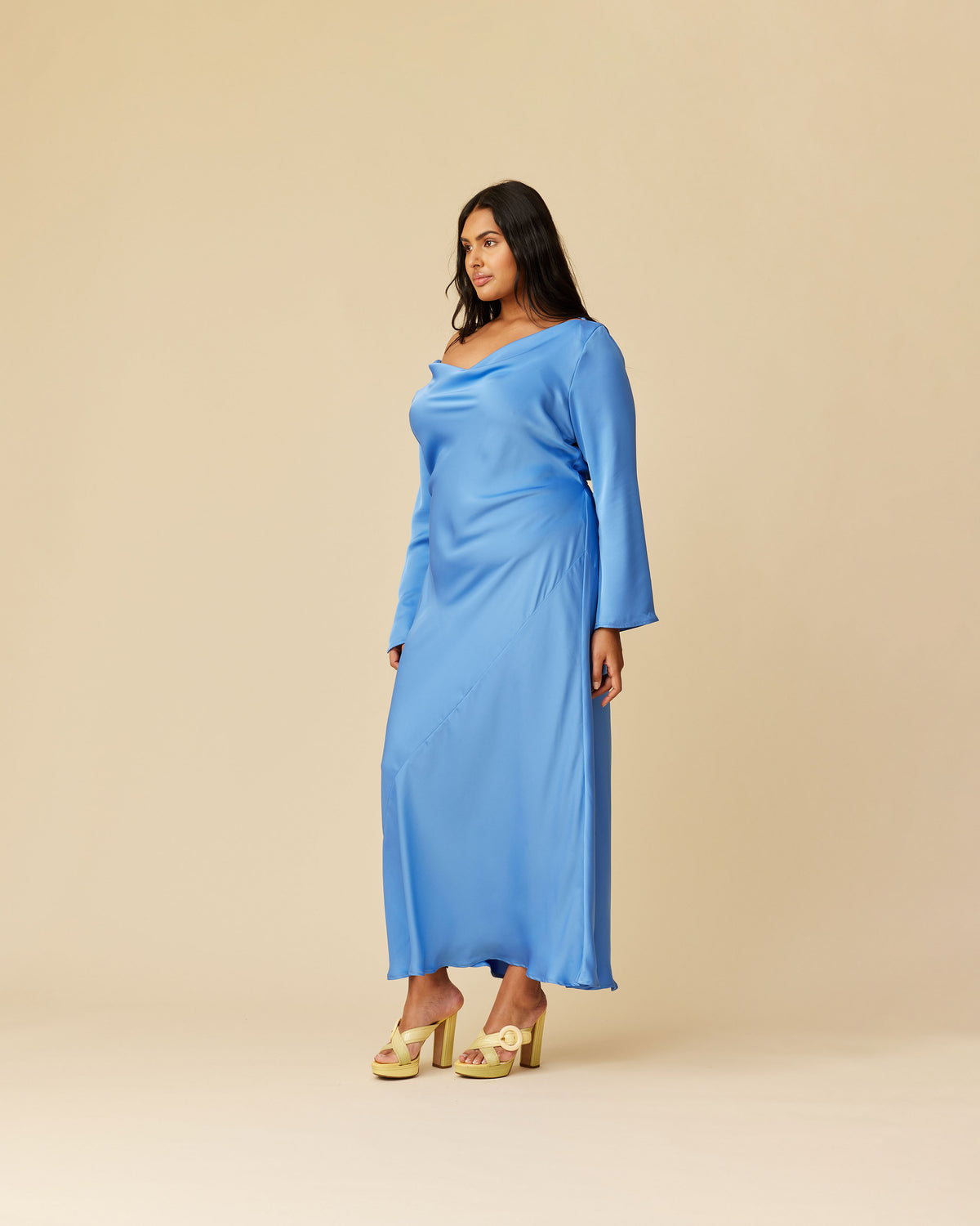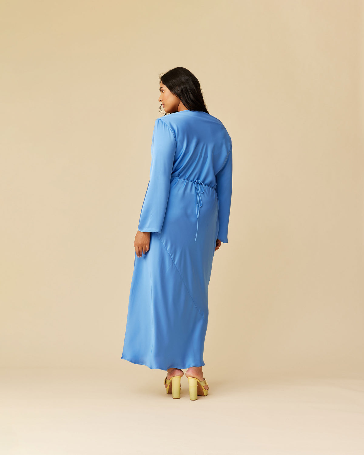 Bias cut long sleeve dress imagined in a luxe sonic blue satin. Features a built in waist tie to allow you to cinch as you wish. Simple yet versatile.