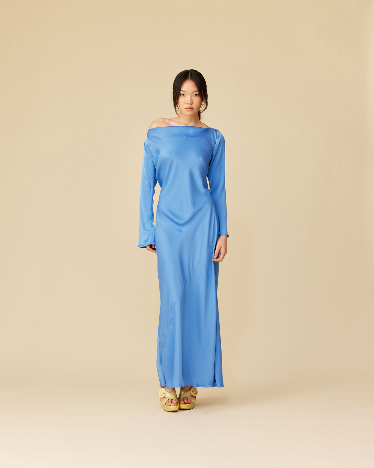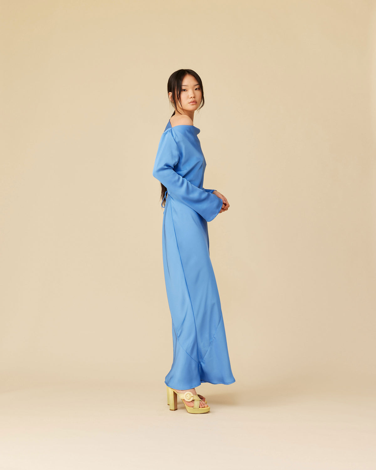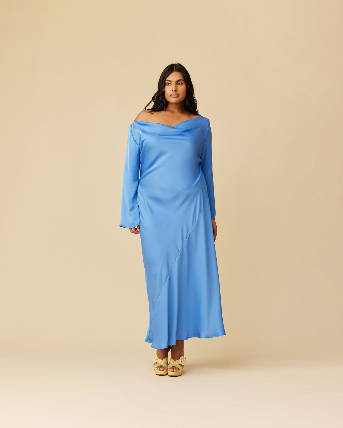 Bias cut long sleeve dress imagined in a luxe sonic blue satin. Features a built in waist tie to allow you to cinch as you wish. Simple yet versatile.