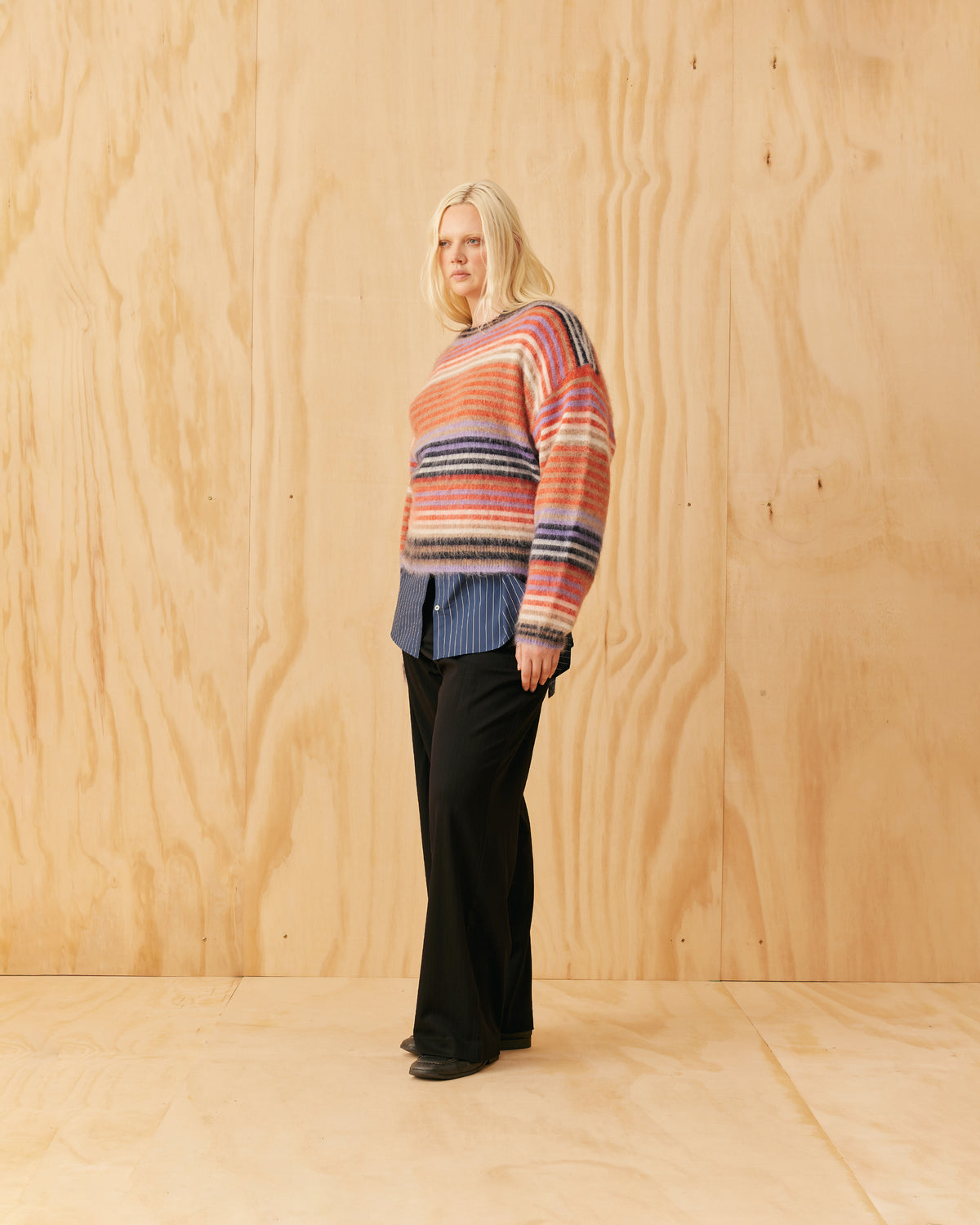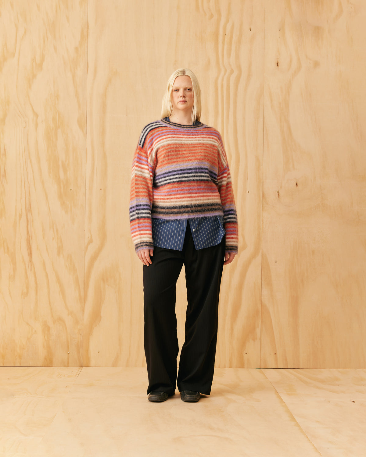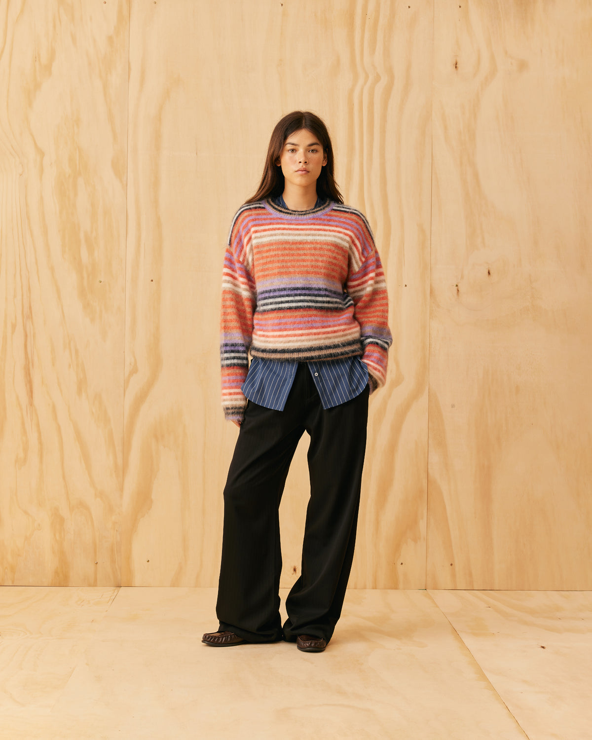 Boxy fit knitted jumper imagined in a colourful heirloom stripe. Crafted in a lush mohair wool blend and featuring subtle batwing sleeves, this jumper is the perfect addition to layer over and under all your winter favourites.