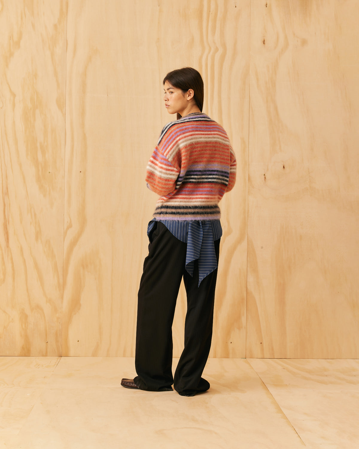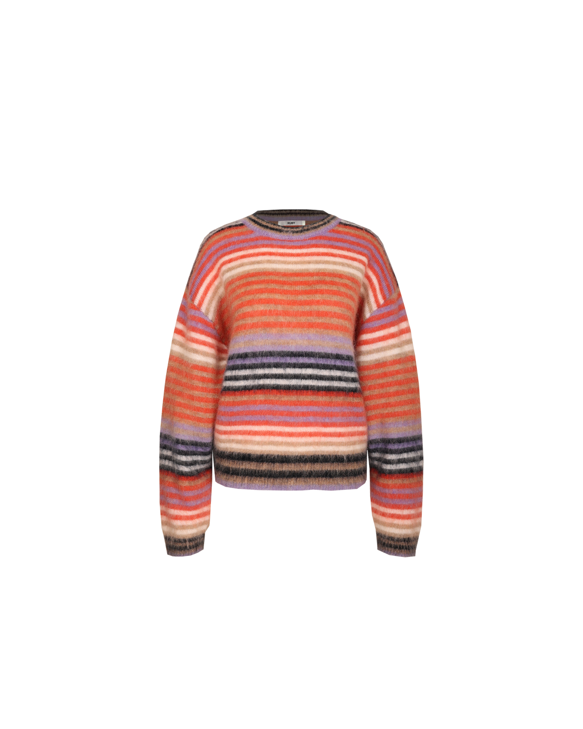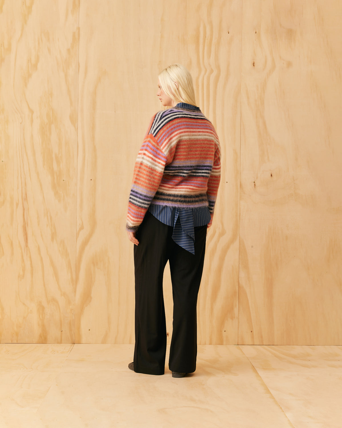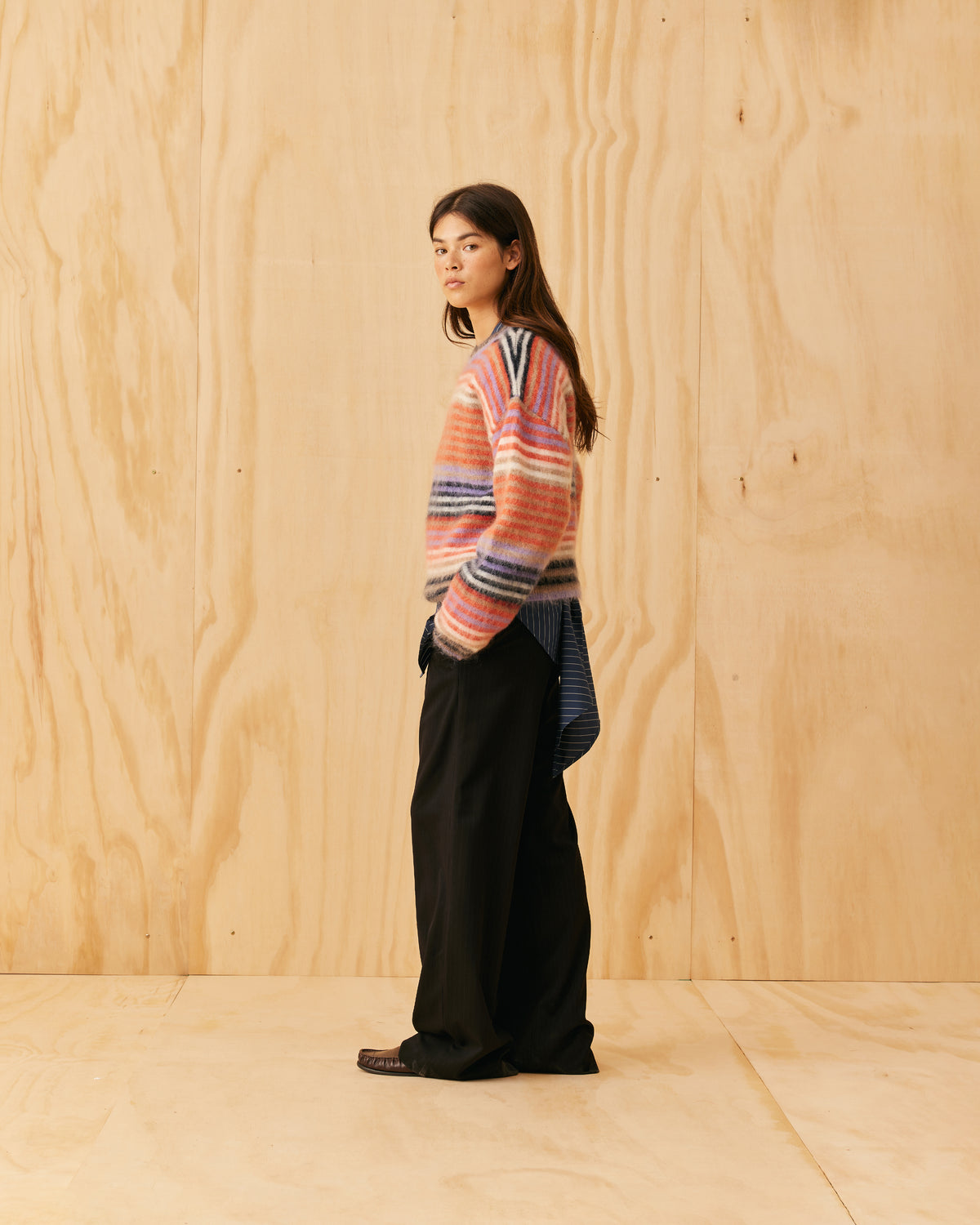 Boxy fit knitted jumper imagined in a colourful heirloom stripe. Crafted in a lush mohair wool blend and featuring subtle batwing sleeves, this jumper is the perfect addition to layer over and under all your winter favourites.