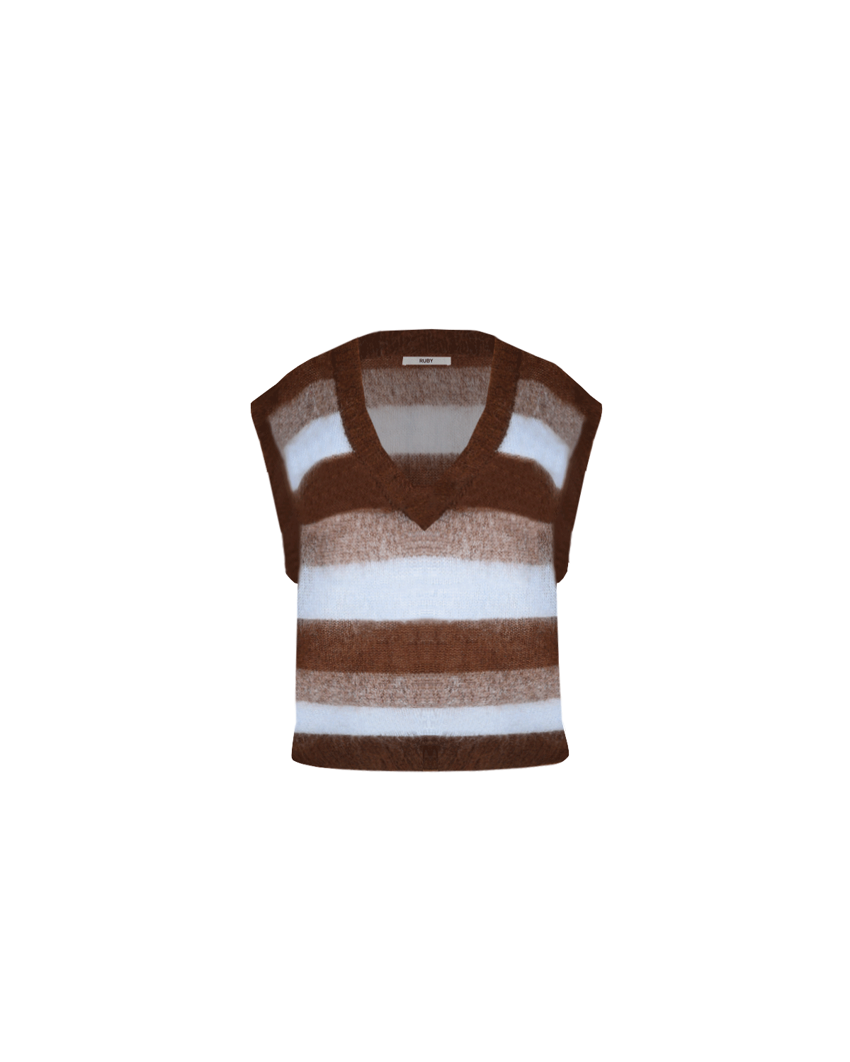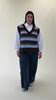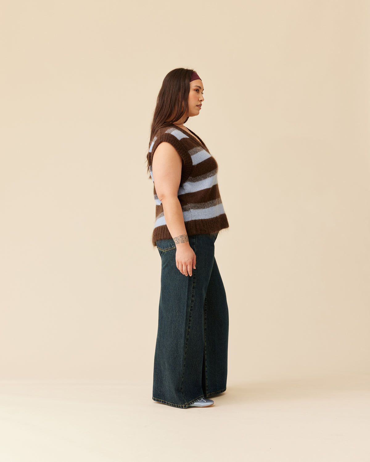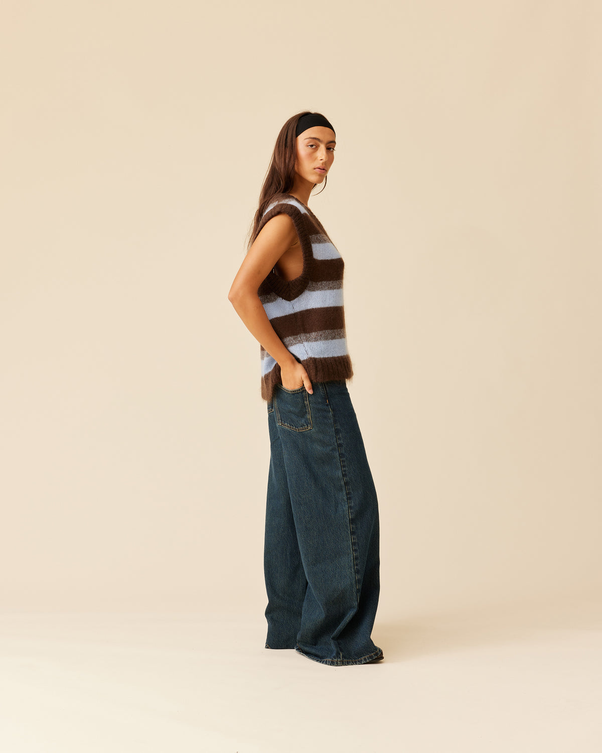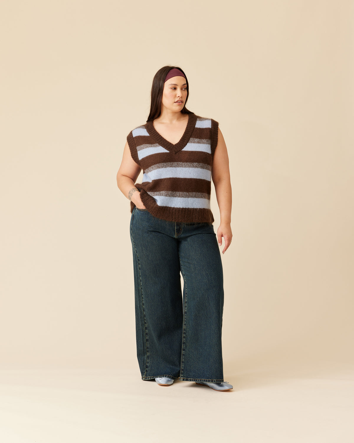 Relaxed fit sleeveless sweater vest, made in a lightweight wool blend with ribbed hem detailing. This piece is perfect for playing with layering over shirts and tops.