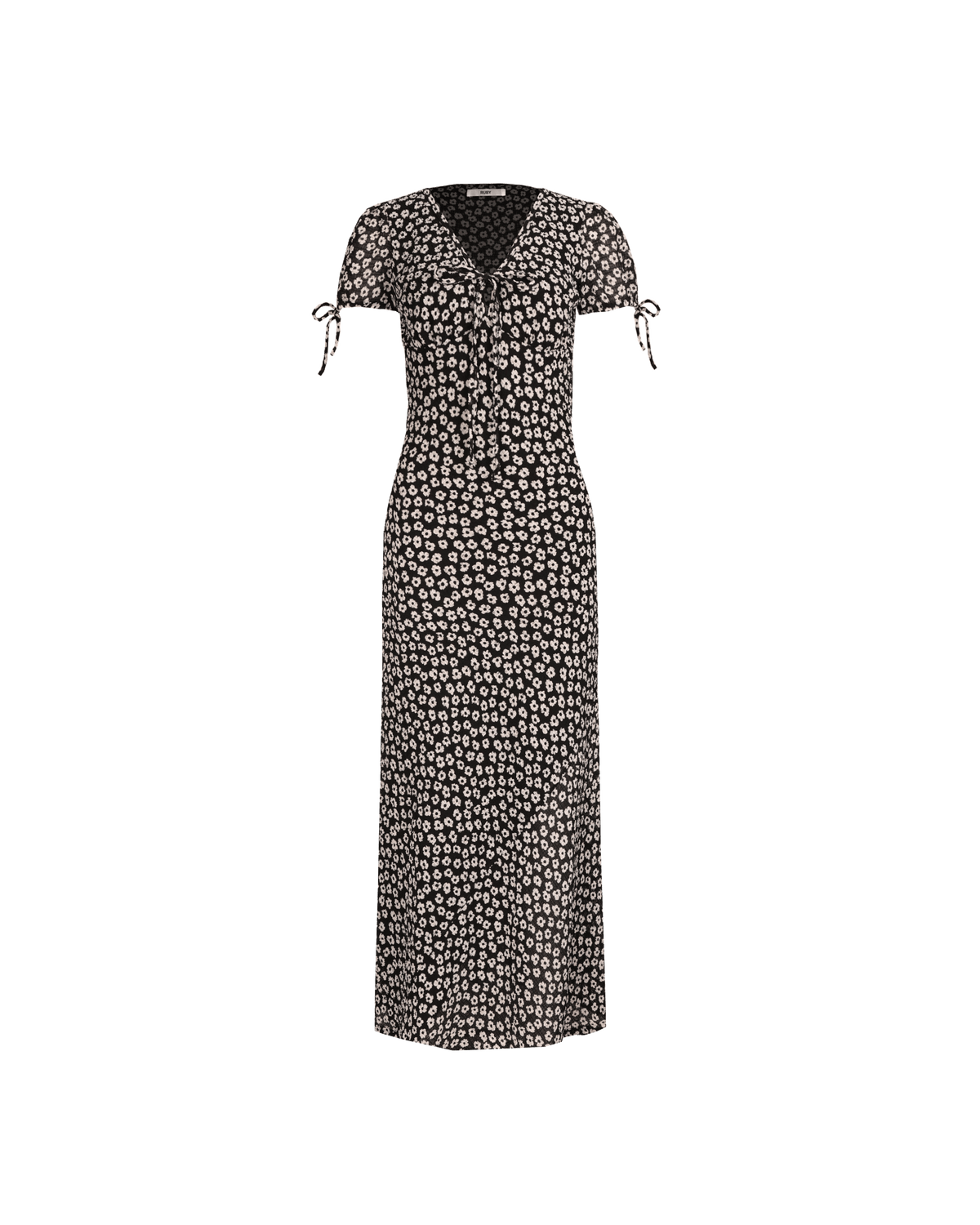 Short sleeve maxi dress imagined in a light-weight daisy print fabric with a crinkle texture. This dress features a V-neckline, with ties at sleeves and a keyhole and tie at the centre.