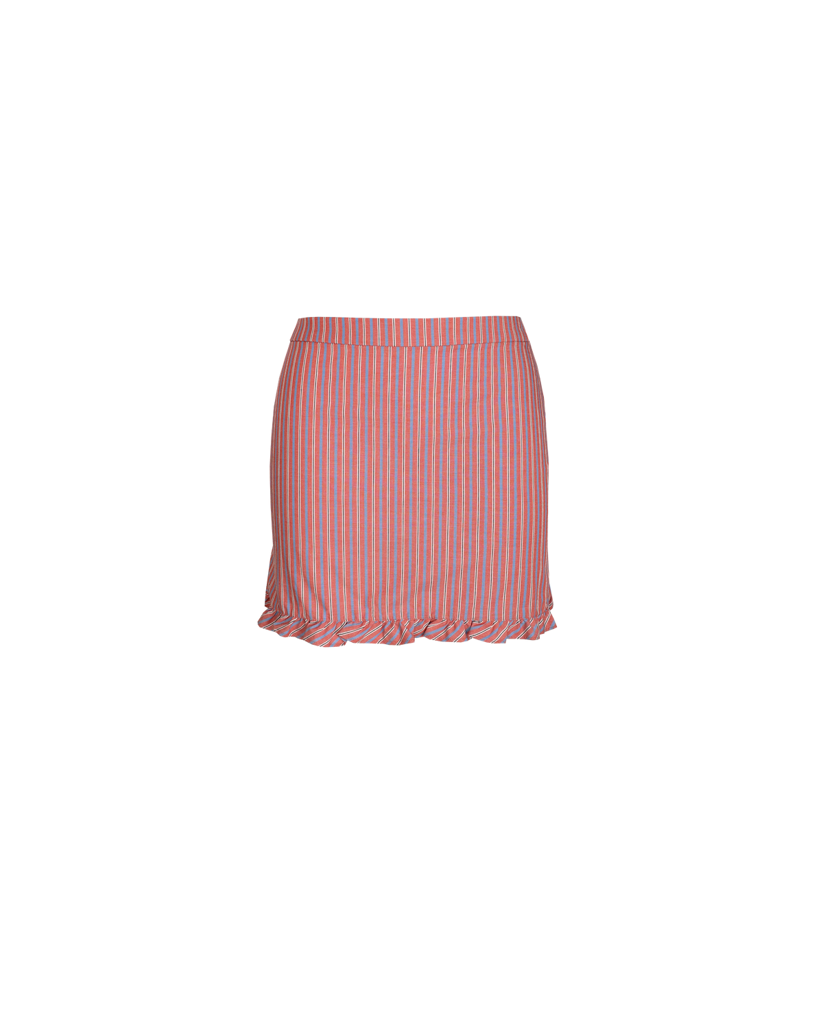 Organic cotton mini skirt with a feature ruffle on the hem, designed in our firewhirl blue stripe. Make it a set by pairing it with our Willa Tank or Sandler Ruffle Shirt.