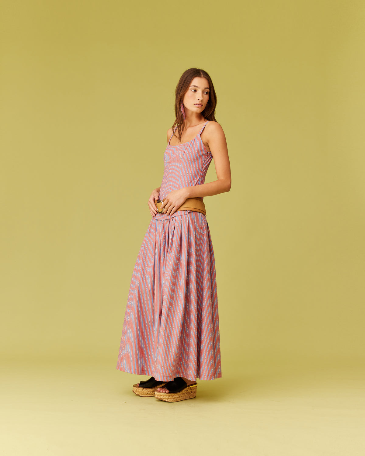 Organic cotton tank designed in our firewhirl blue stripe. This tank features a scoop neckline, adjustable straps and darts through the body to create a fitted look. The perfect elevated basic to pair with denim or make it a matching set with our Sandler Skirt.